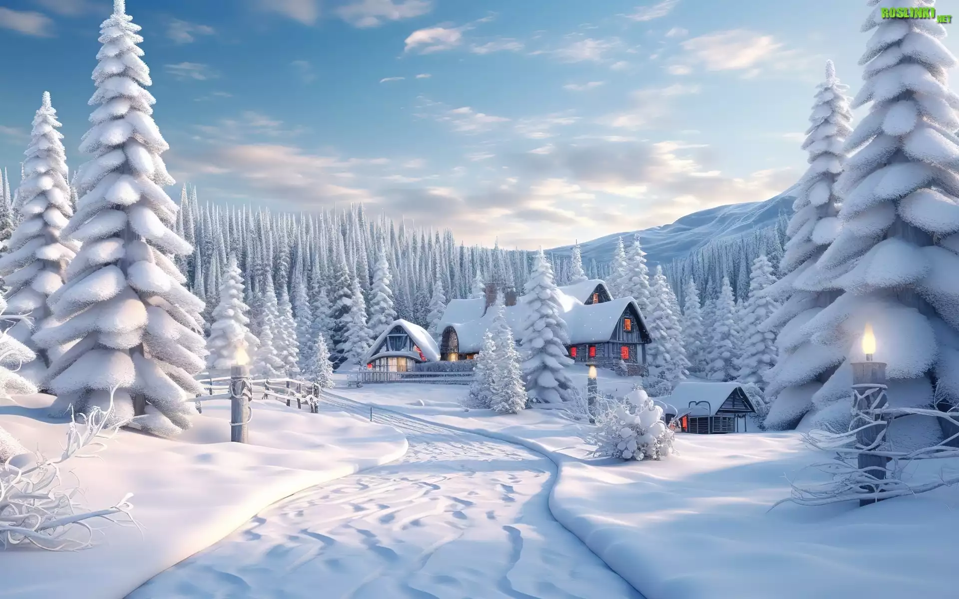 Rośliny: Zima, Las, Ośnieżone, Drzewa, Domy, Droga, Chmury, 2D