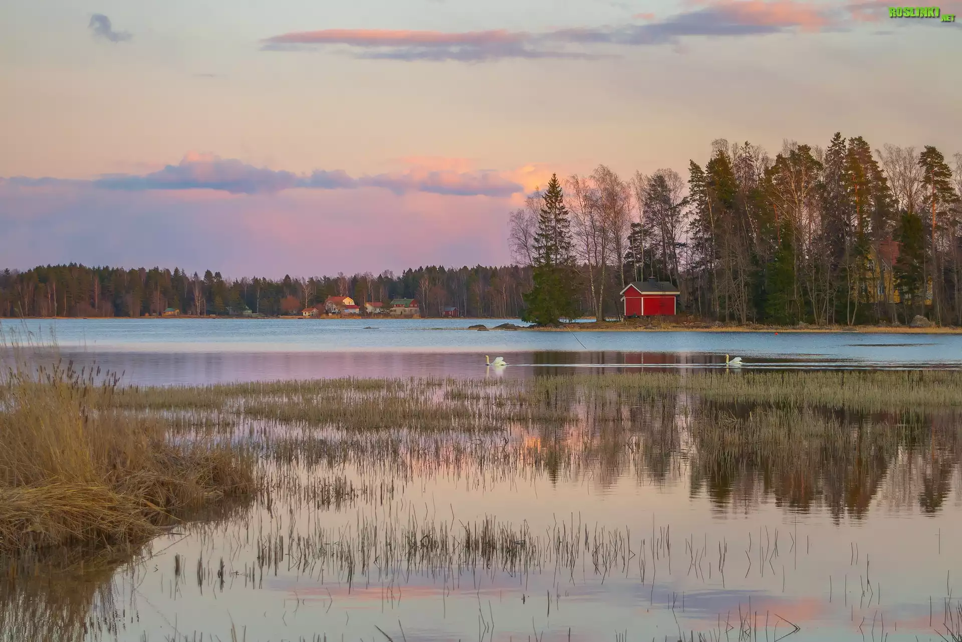 Rośliny: Jezioro, Łabędzie, Trawy, Drzewa, Domy, Raski, Kotka, Finlandia