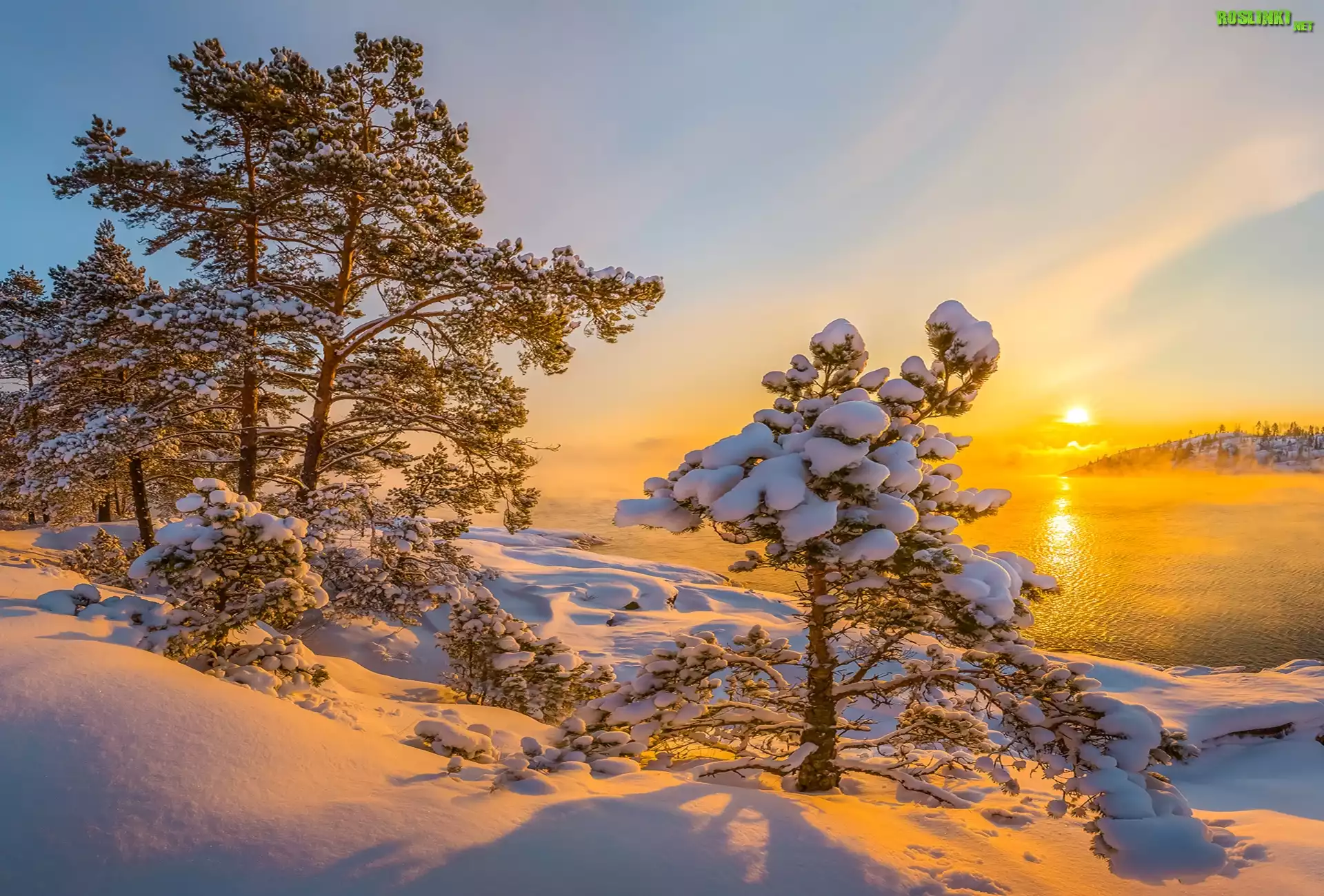 Rośliny: Zima, Jezioro Ładoga, Ośnieżone, Drzewa, Mgła, Wschód słońca, Republika Karelii, Rosja