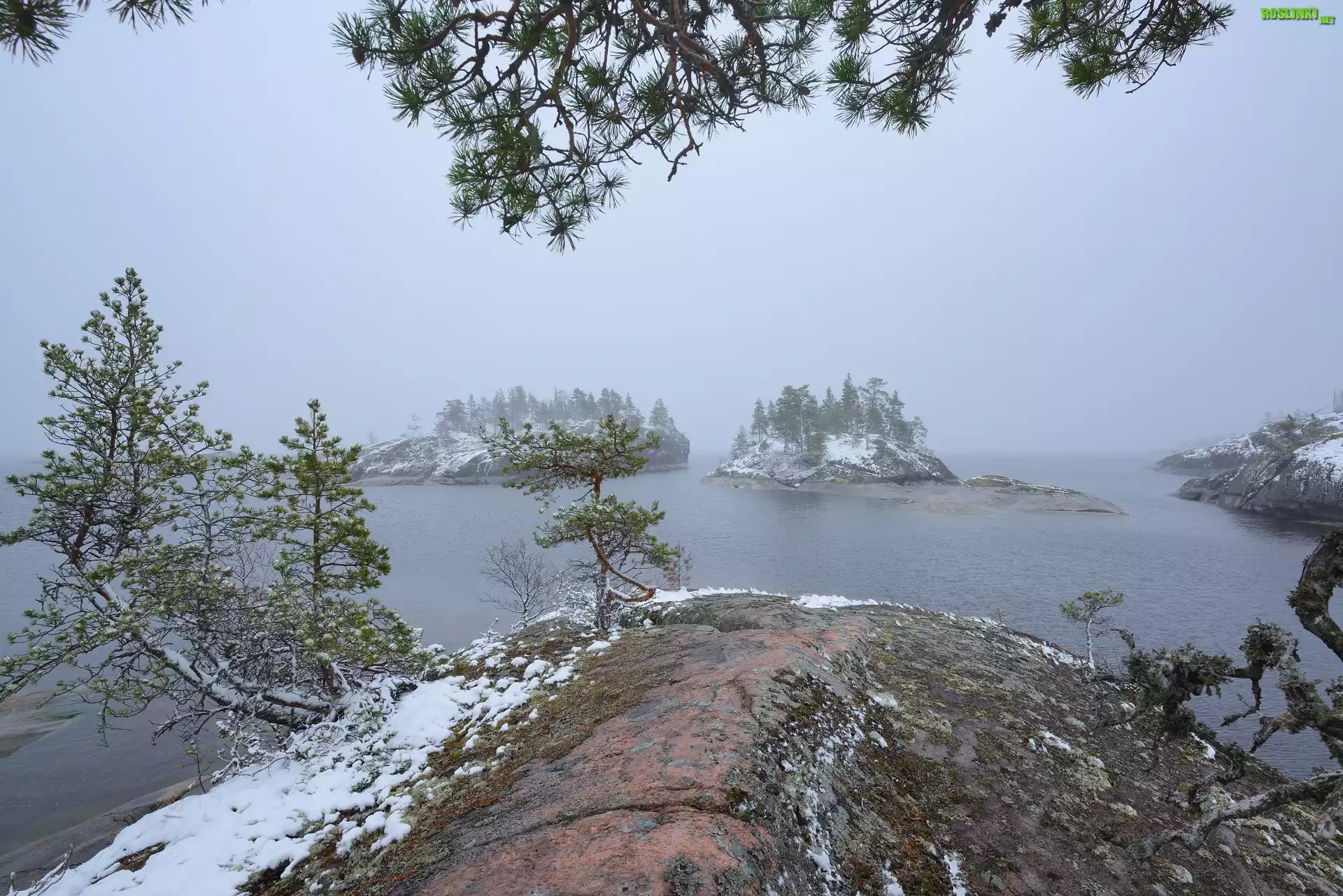 Rośliny: Jezioro Ładoga, Wysepki, Drzewa, Śnieg, Mgła, Rosja