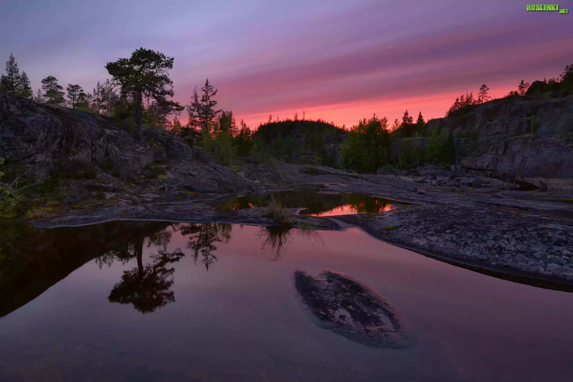 Rośliny: Jezioro Ładoga, Skały, Drzewa, Zachód słońca, Odbicie, Rosja