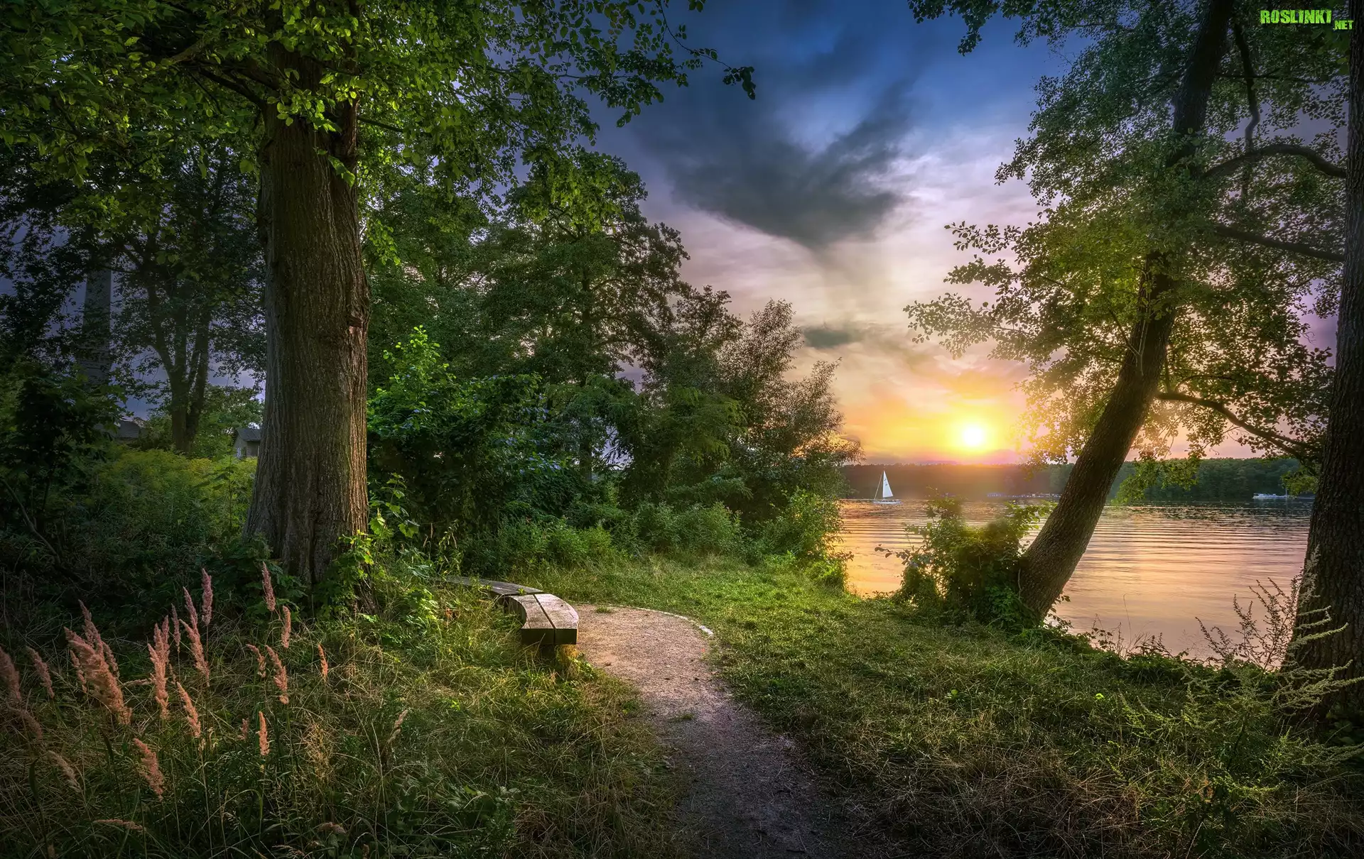 Rośliny: Park, Jezioro, Drzewa, Ławka, Ścieżka, Wschód słońca, Chmury, Żaglówka