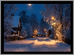 Zima, Droga, Drzewa, Światła, Domy, Księżyc, Grafika AI