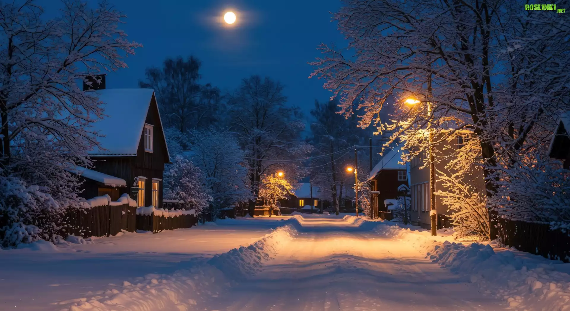 Rośliny: Zima, Droga, Drzewa, Światła, Domy, Księżyc, Grafika AI