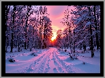 Rośliny: Zima, Droga, Drzewa, Las, Zachód słońca, Grafika AI