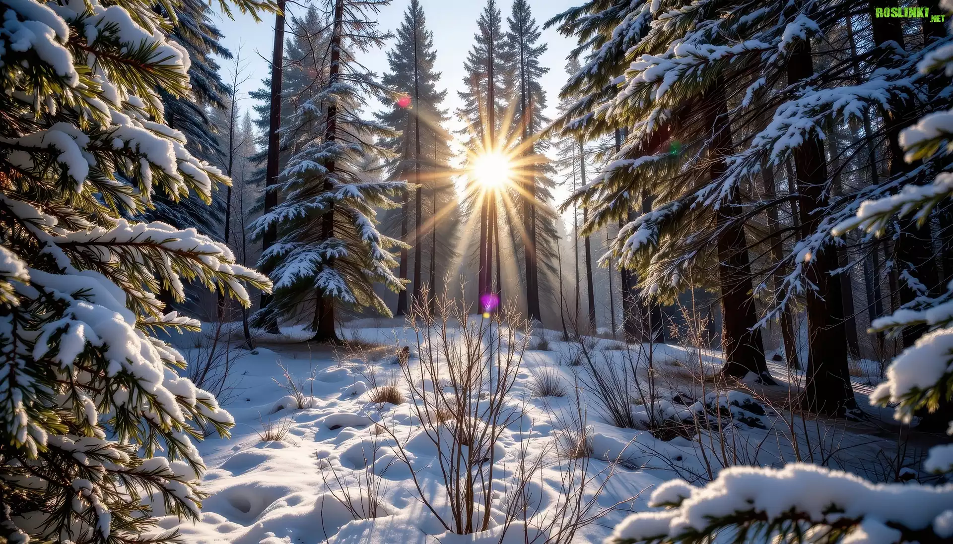 Rośliny: Zima, Las, Drzewa, Polana, Promienie słońca, Grafika AI