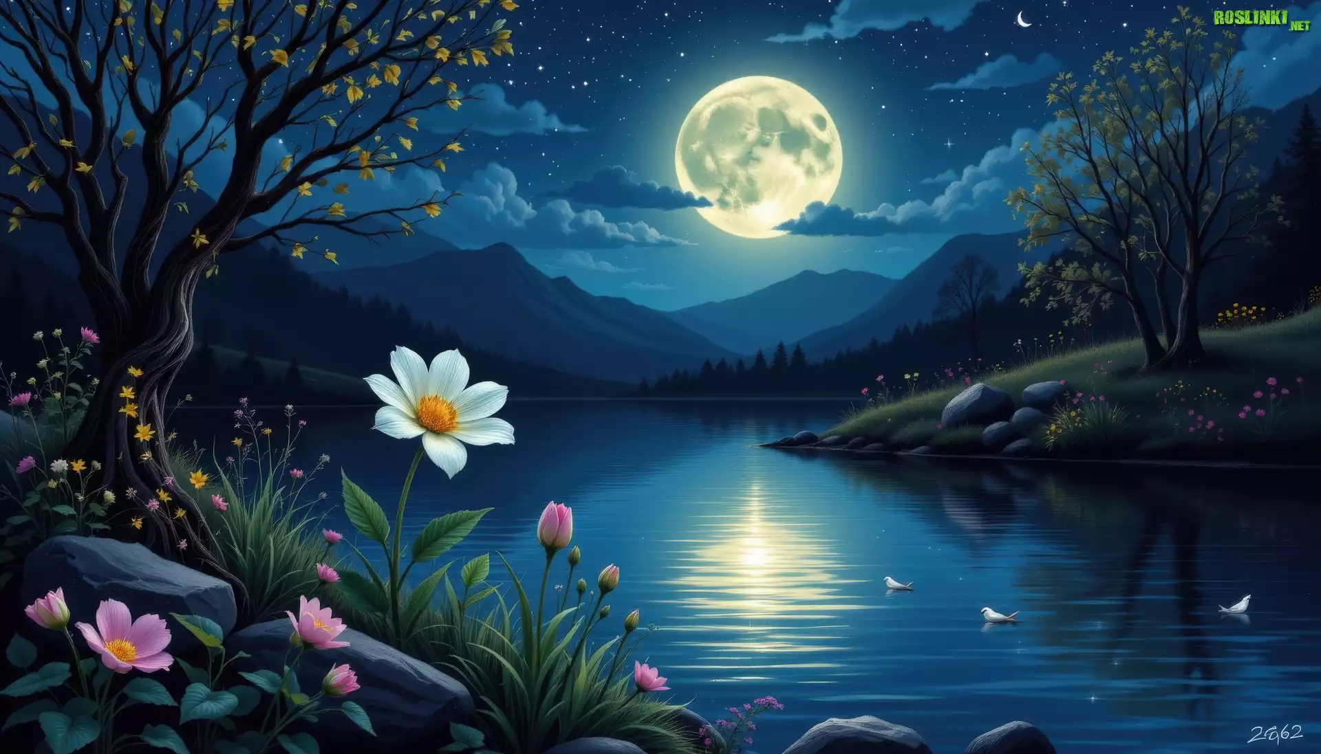 Rośliny: Kwiaty, Drzewa, Jezioro, Księżyc, Noc, Góry, Grafika AI