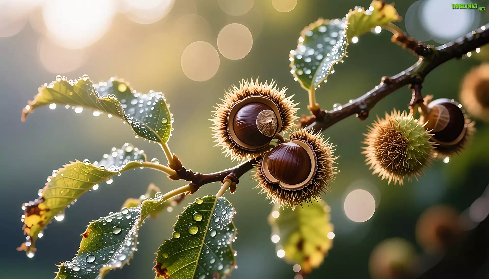 Rośliny: Kasztan jadalny, Kasztany, Gałązka, Krople, Liście, Grafika AI