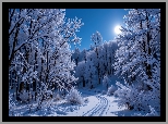 Zima, Noc, Księżyc, Las, Ośnieżone, Drzewa, Droga, AI