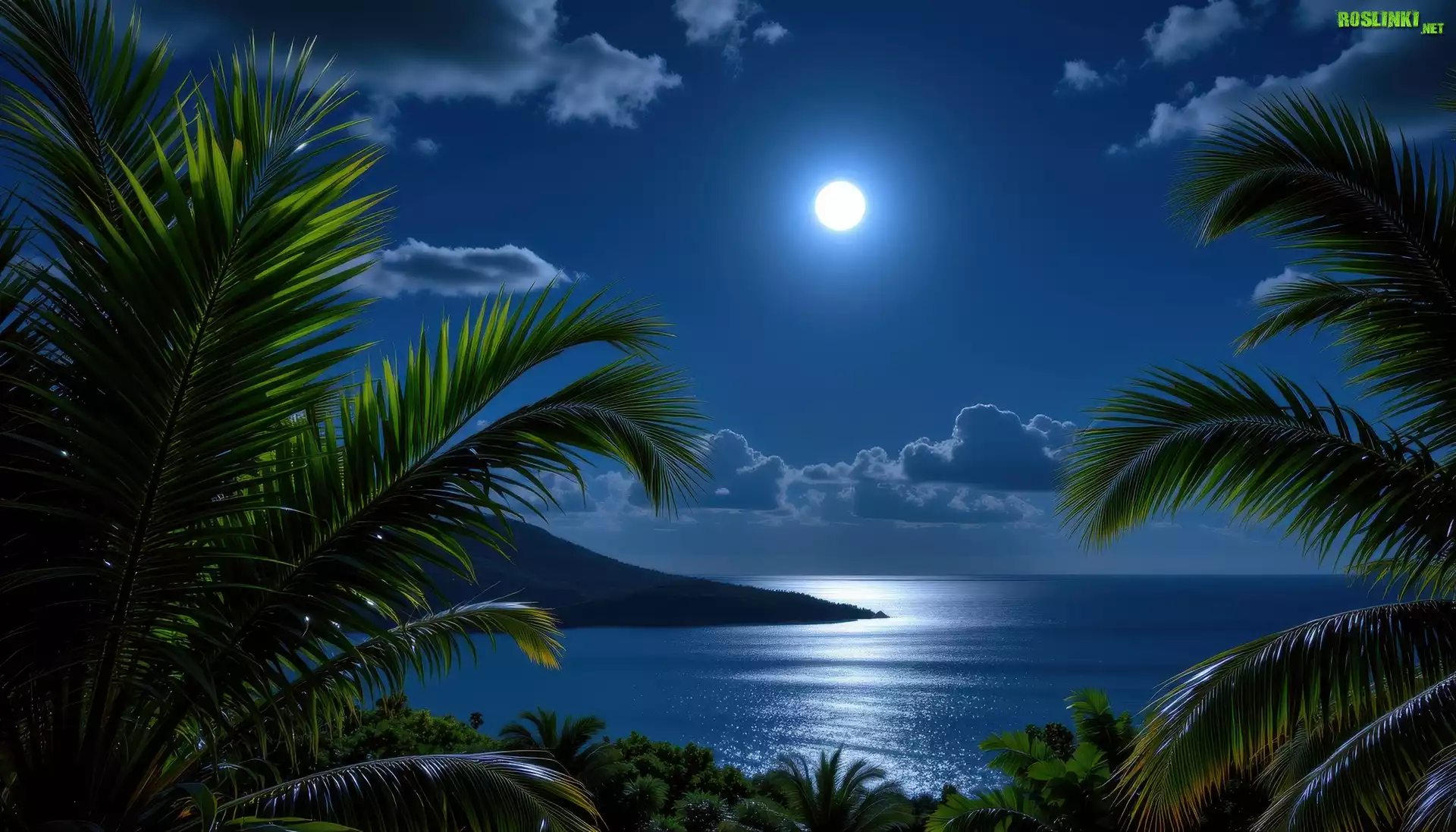 Rośliny: Palmy, Liście, Morze, Noc, Księżyc, Niebo, Chmury, AI