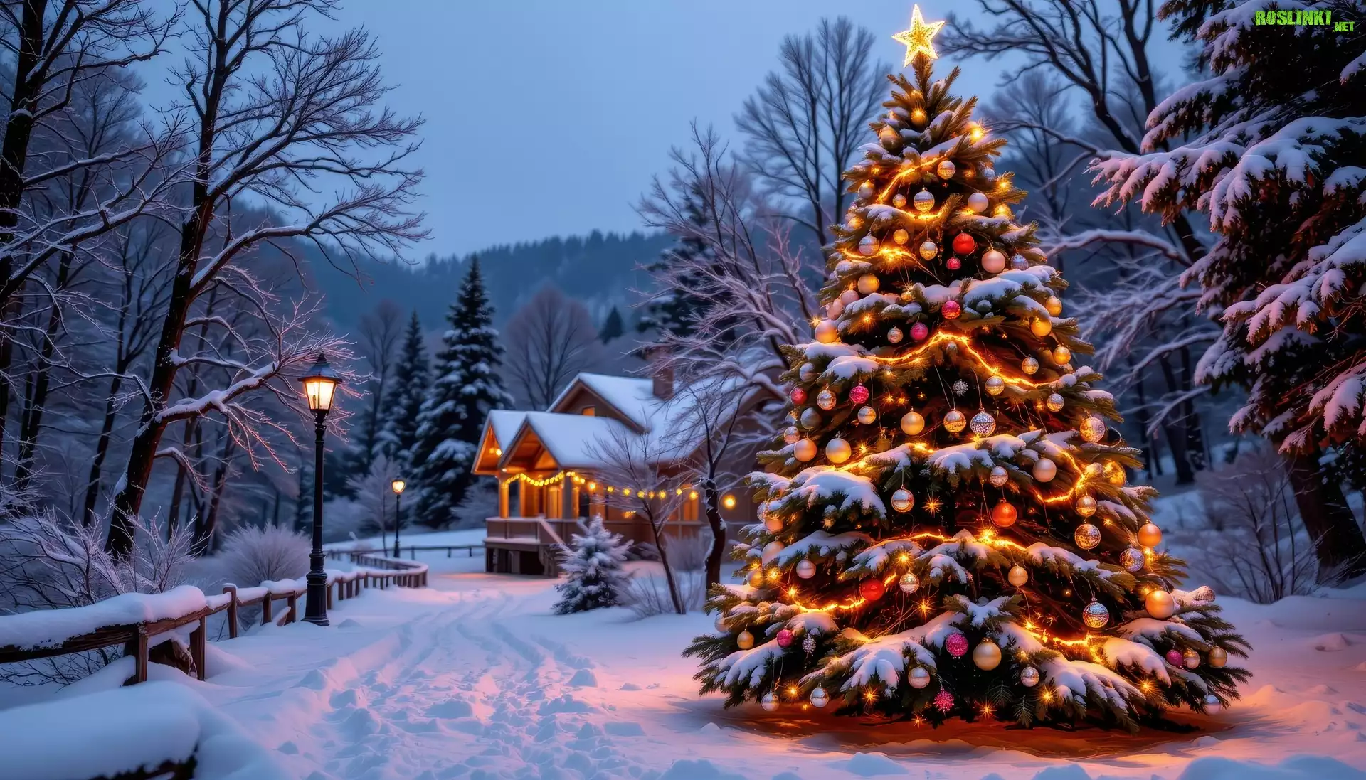 Rośliny: Zima, Boże Narodzenie, Choinka, Dom, Drzewa, Latarnie, AI