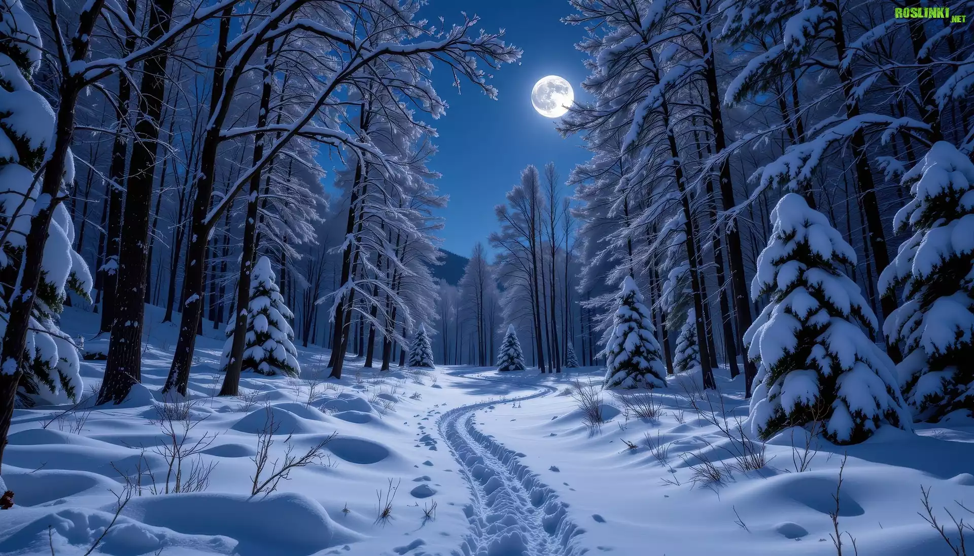 Rośliny: Zima, Droga, Ośnieżone, Drzewa, Noc, Księżyc, Grafika AI