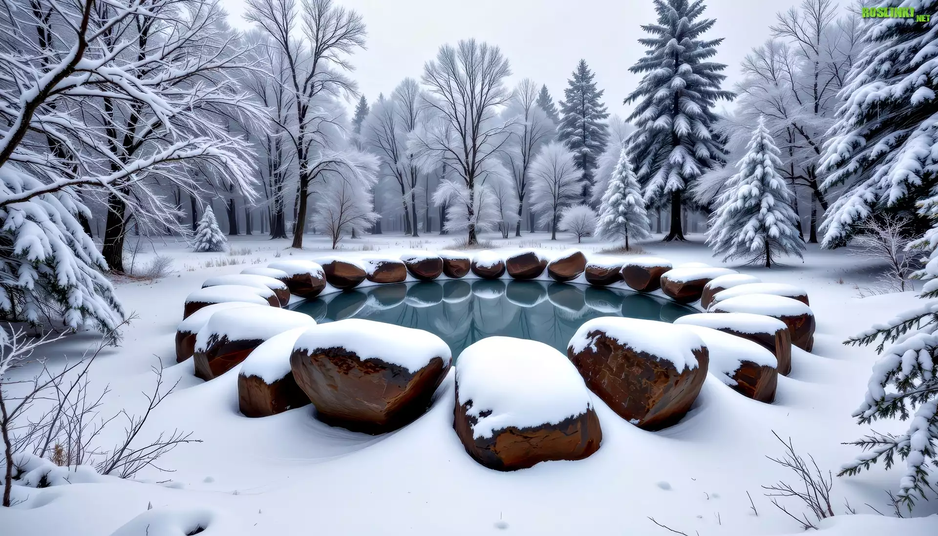 Rośliny: Zima, Drzewa, Polana, Woda, Kamienie, Las, Grafika AI