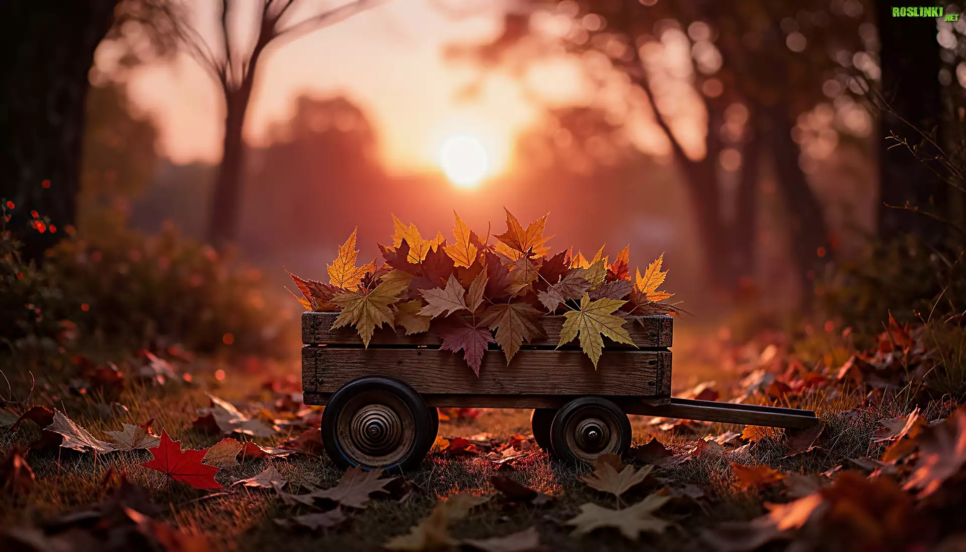 Rośliny: Drewniany, Wózek, Pożółkłe, Liście, Zachód słońca, Grafika AI