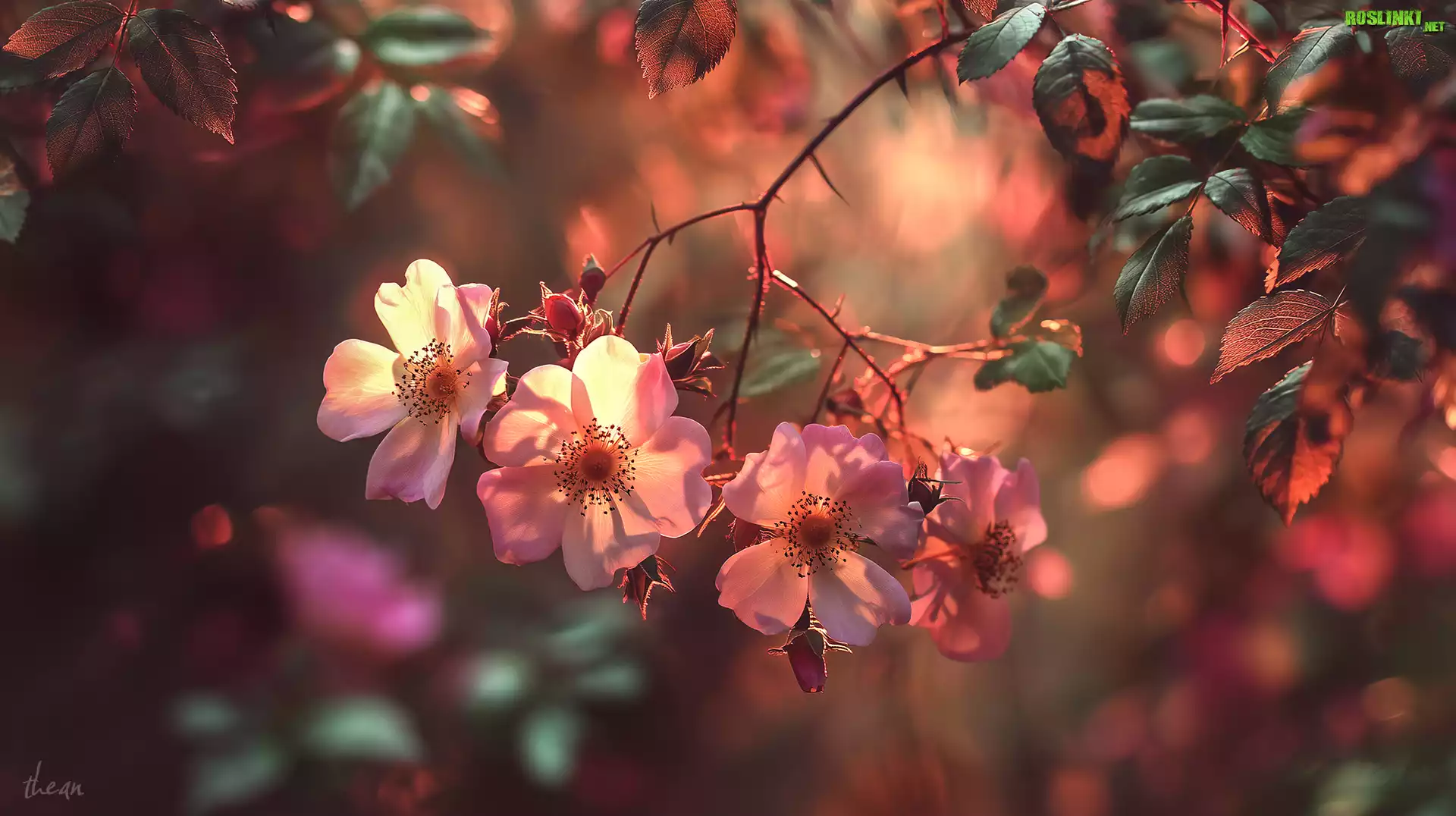 Rośliny: Dzika róża, Różowe, Kwiaty, Gałązki, Liście, Grafika AI