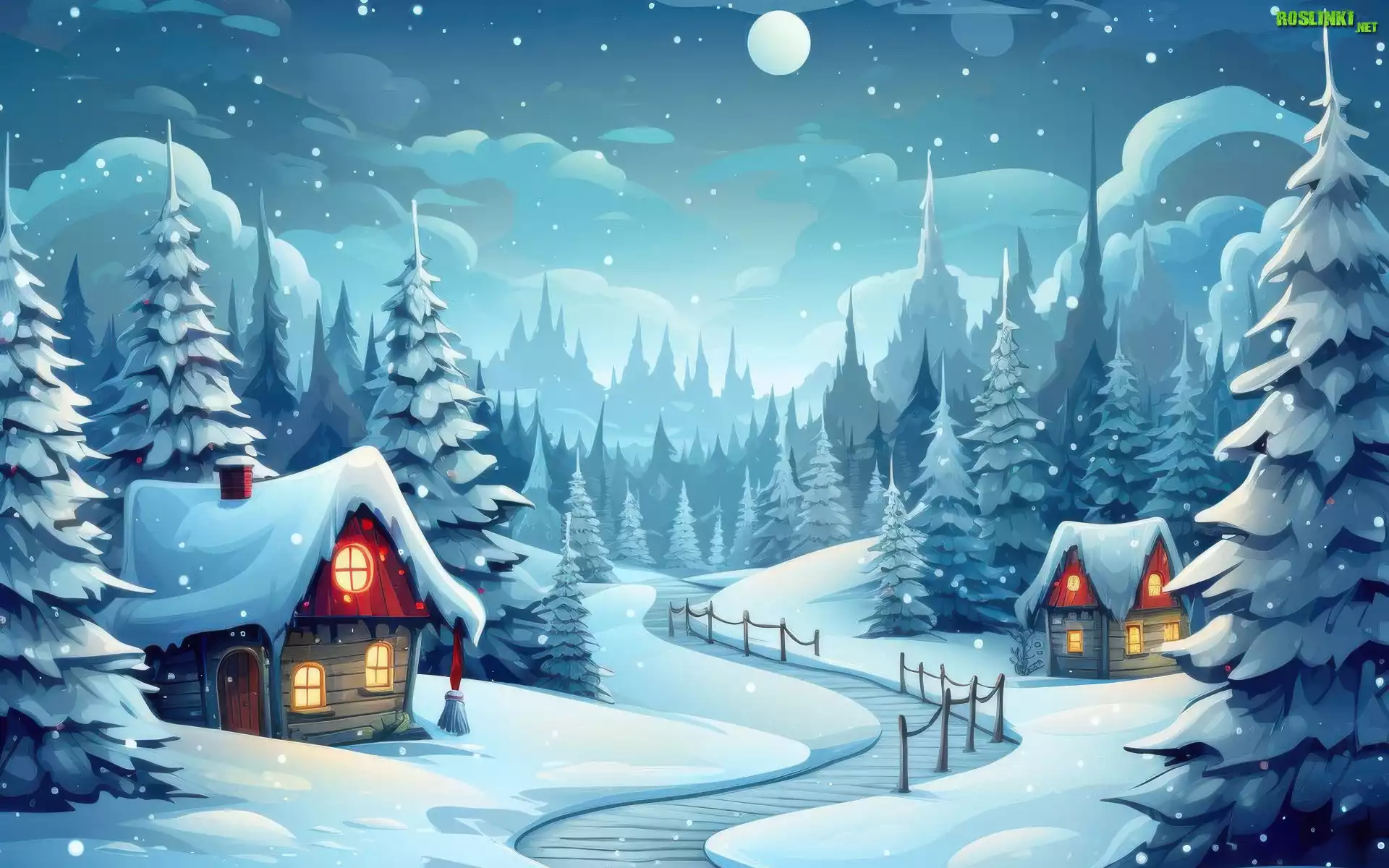 Rośliny: Zima, Domy, Rzeka, Las, Śnieg, Drzewa, Księżyc, AI
