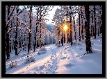 Zima, Drzewa, Ścieżka, Las, Promienie słońca, Grafika AI
