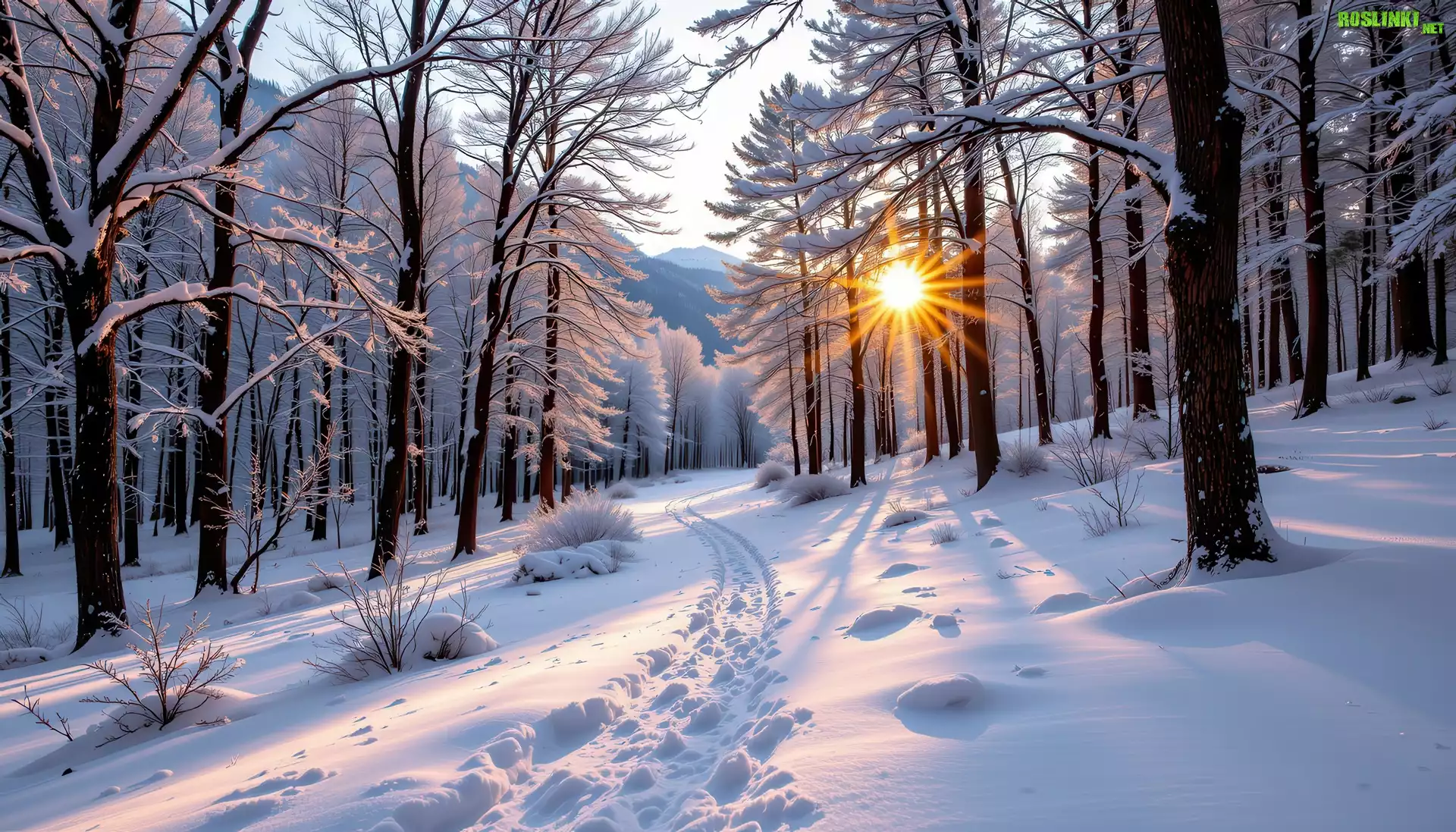 Rośliny: Zima, Drzewa, Ścieżka, Las, Promienie słońca, Grafika AI