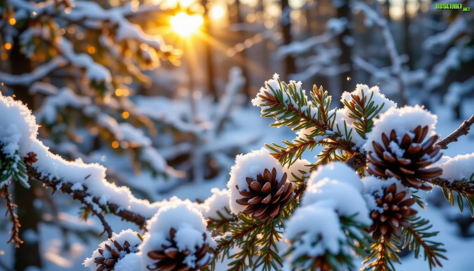 Rośliny: Ośnieżona, Gałąź, Szyszki, Las, Zachód słońca, Grafika AI