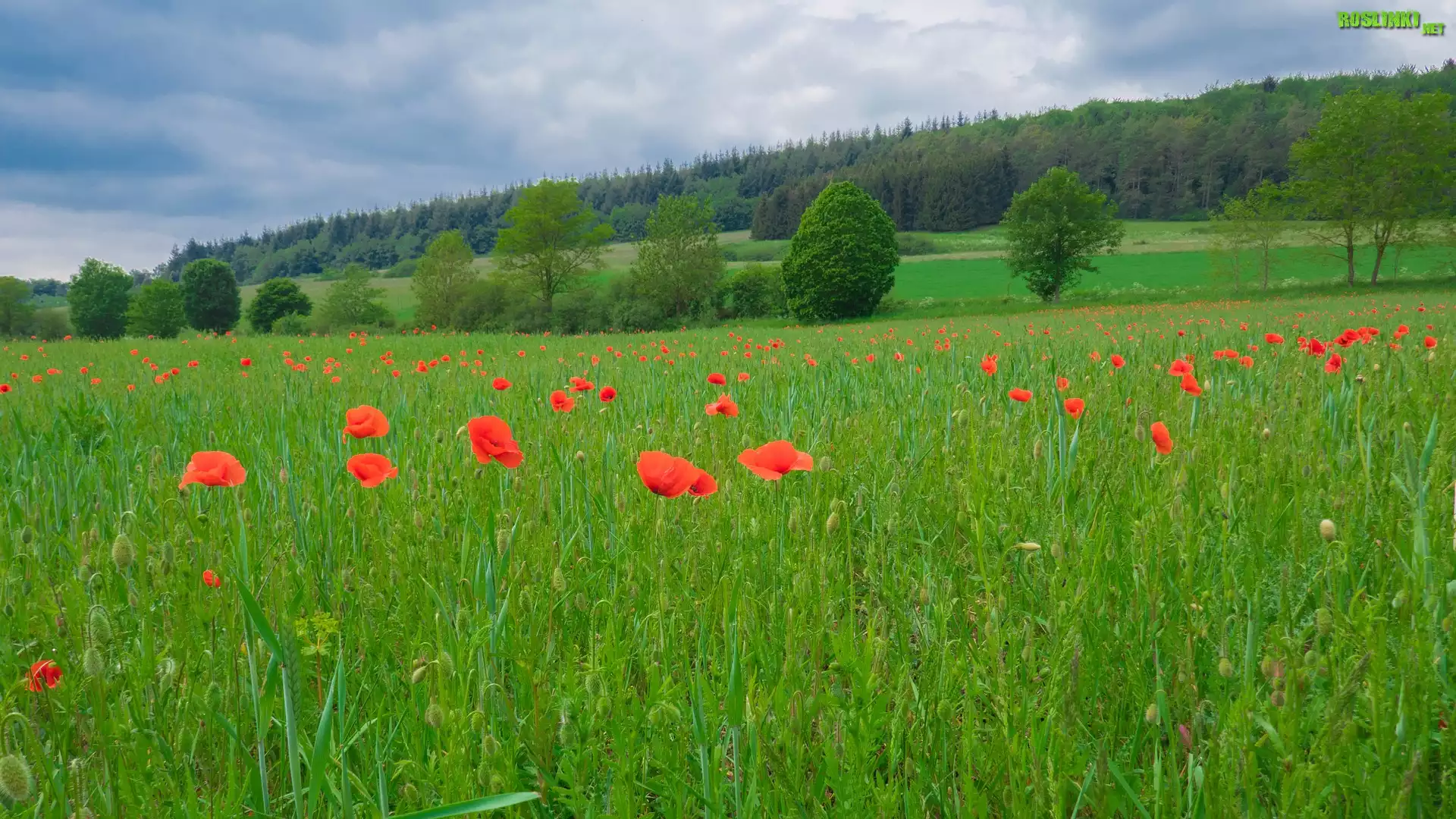 Rośliny: Łąka, Maki, Drzewa, Las, Wzgórze, Chmury