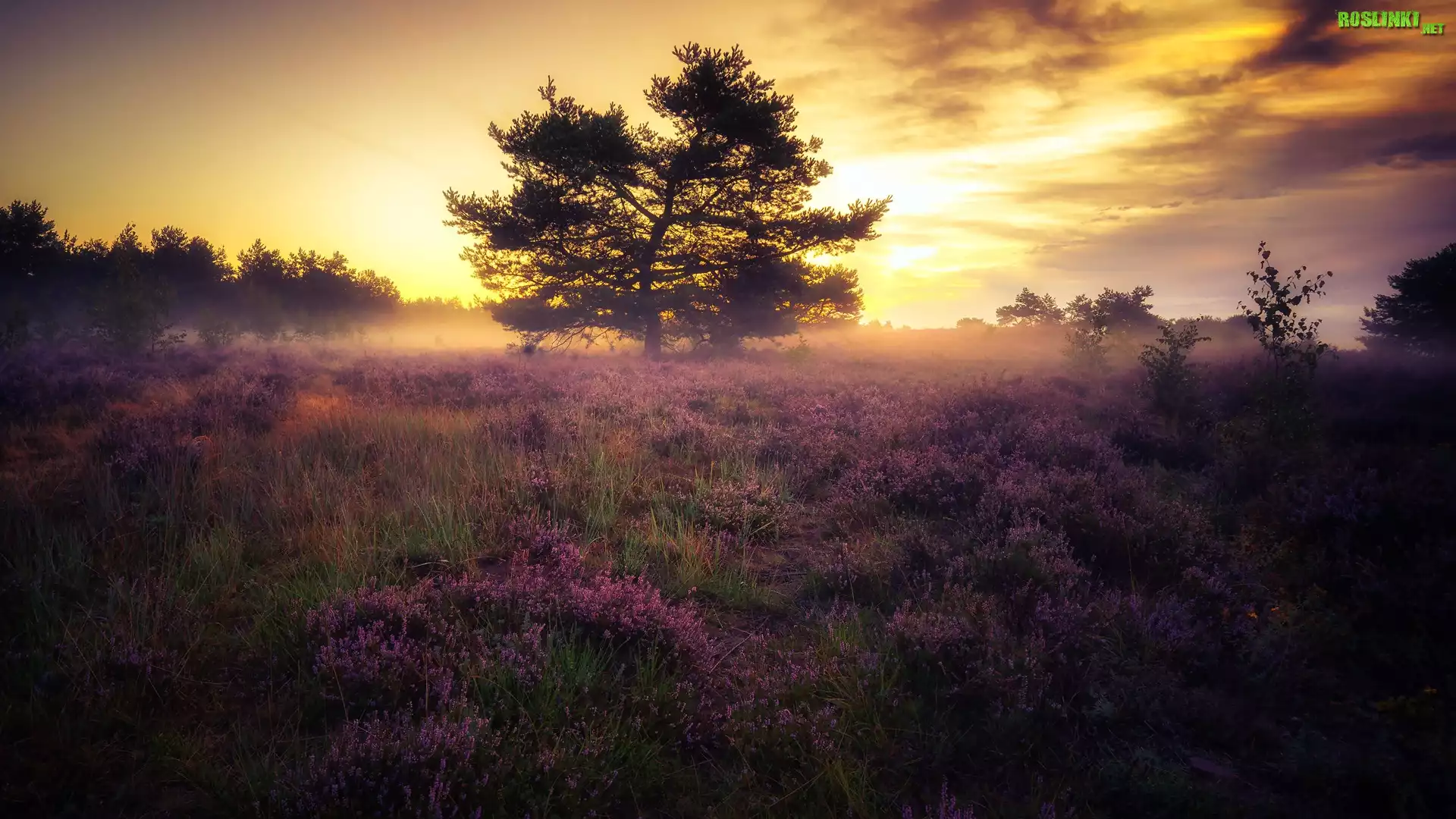 Rośliny: Łąka, Wschód słońca, Mgła, Wrzosowisko, Drzewa