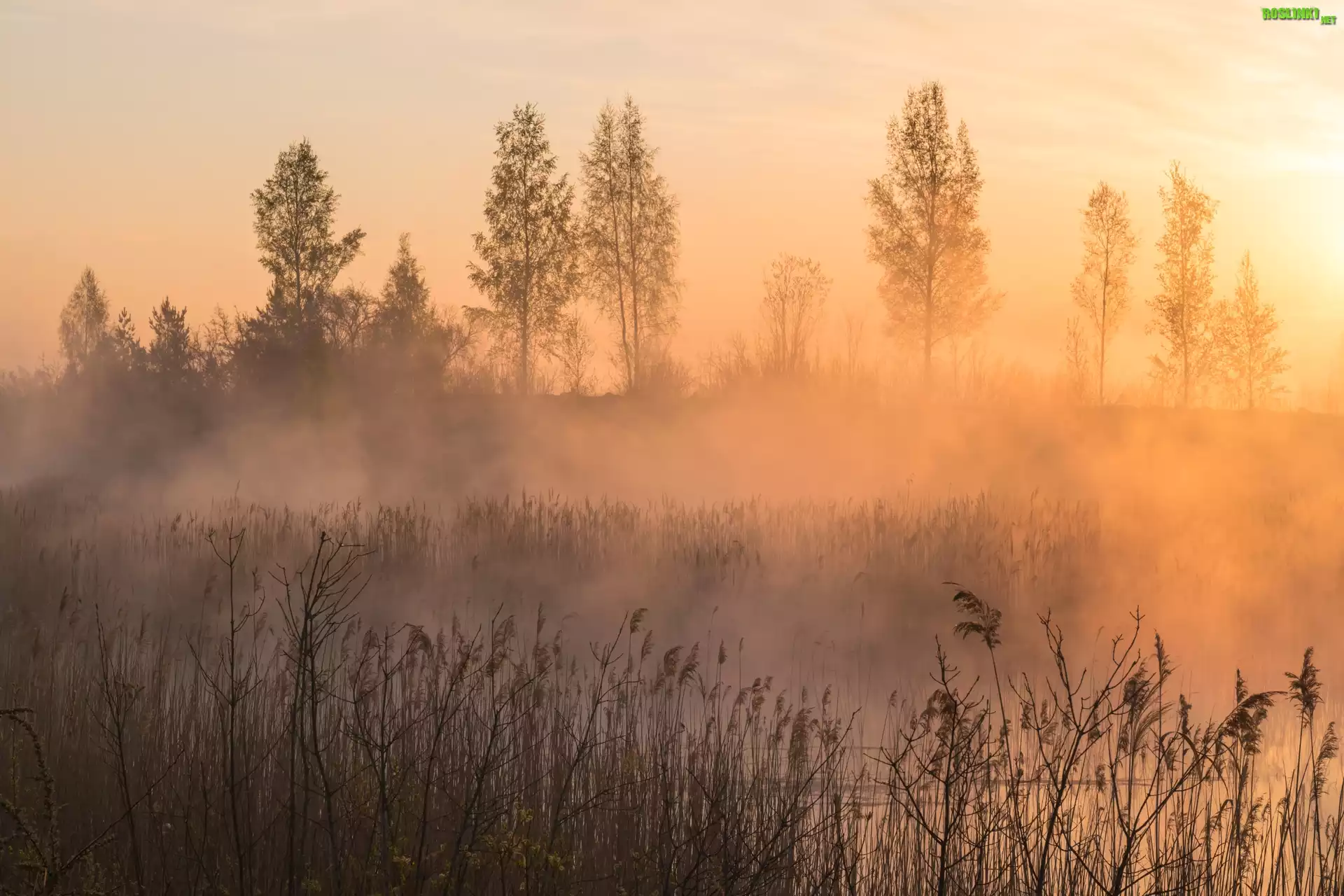 Rośliny: Łąka, Mgła, Trawa, Drzewa, Wschód słońca
