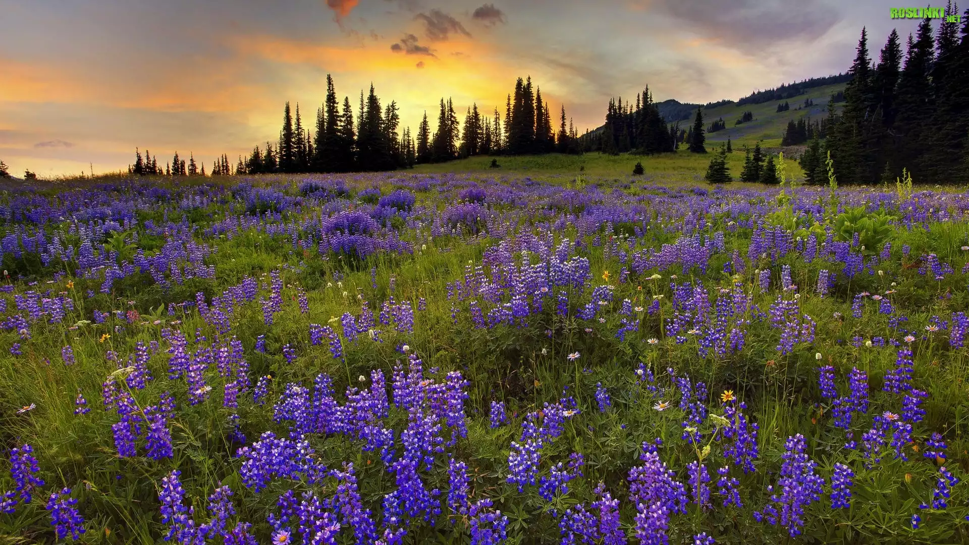 Rośliny: Łąka, Promienie, Zachodzącego, Słońca, Drzewa, Łubin