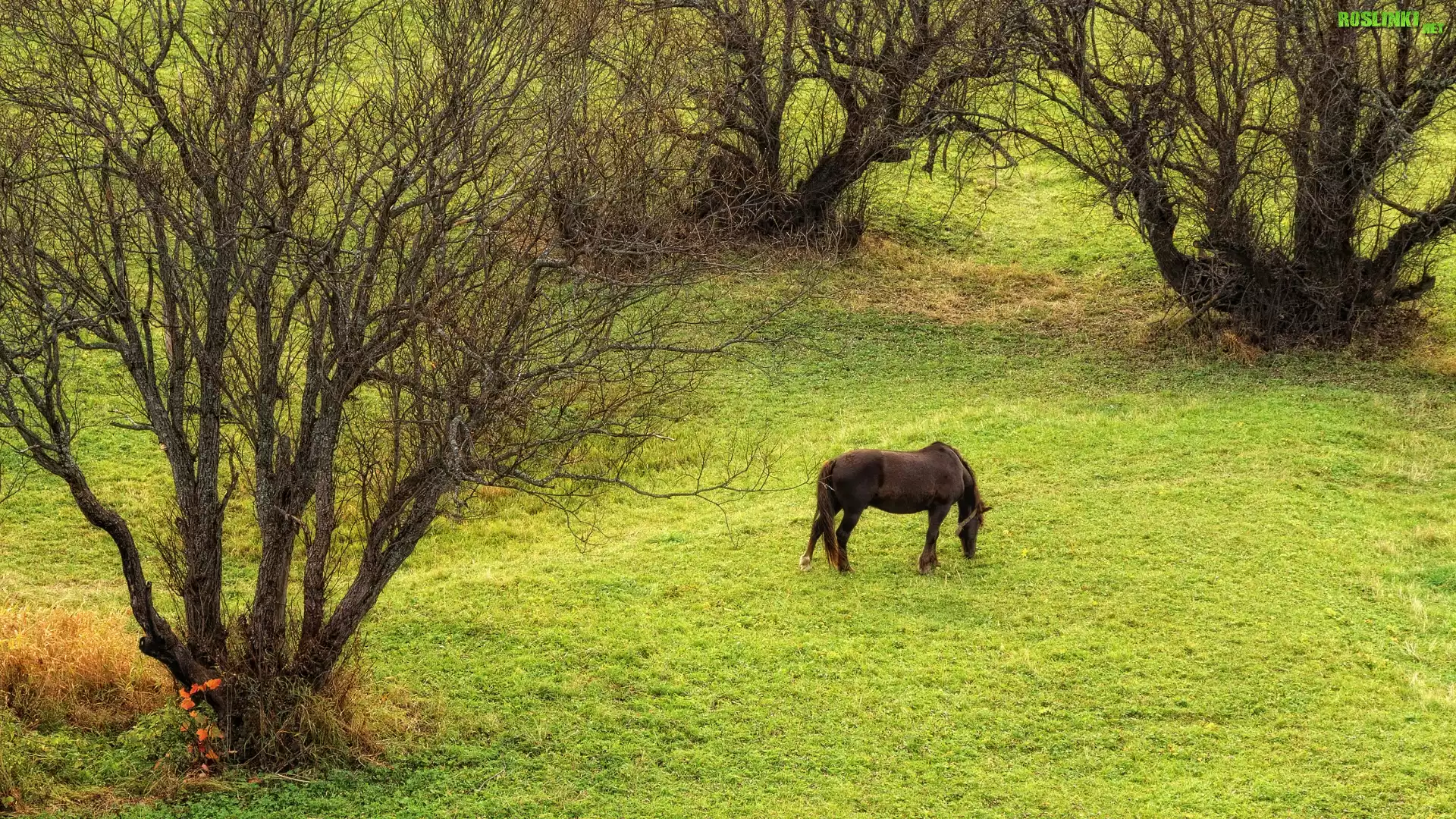 Drzewa, Łąka, Koń