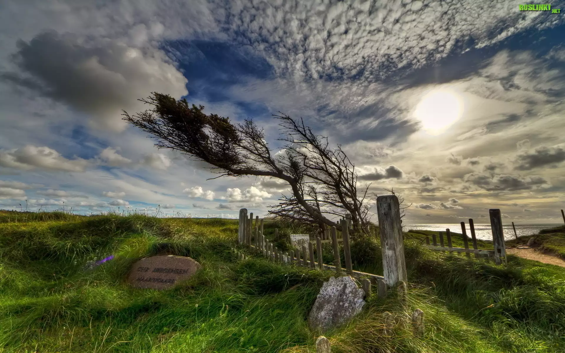 Rośliny: Niebo, Chmury, Drzewo, Wiatr, Pomnik, Ogrodzenie, Przebijające, Słońce, Łąka