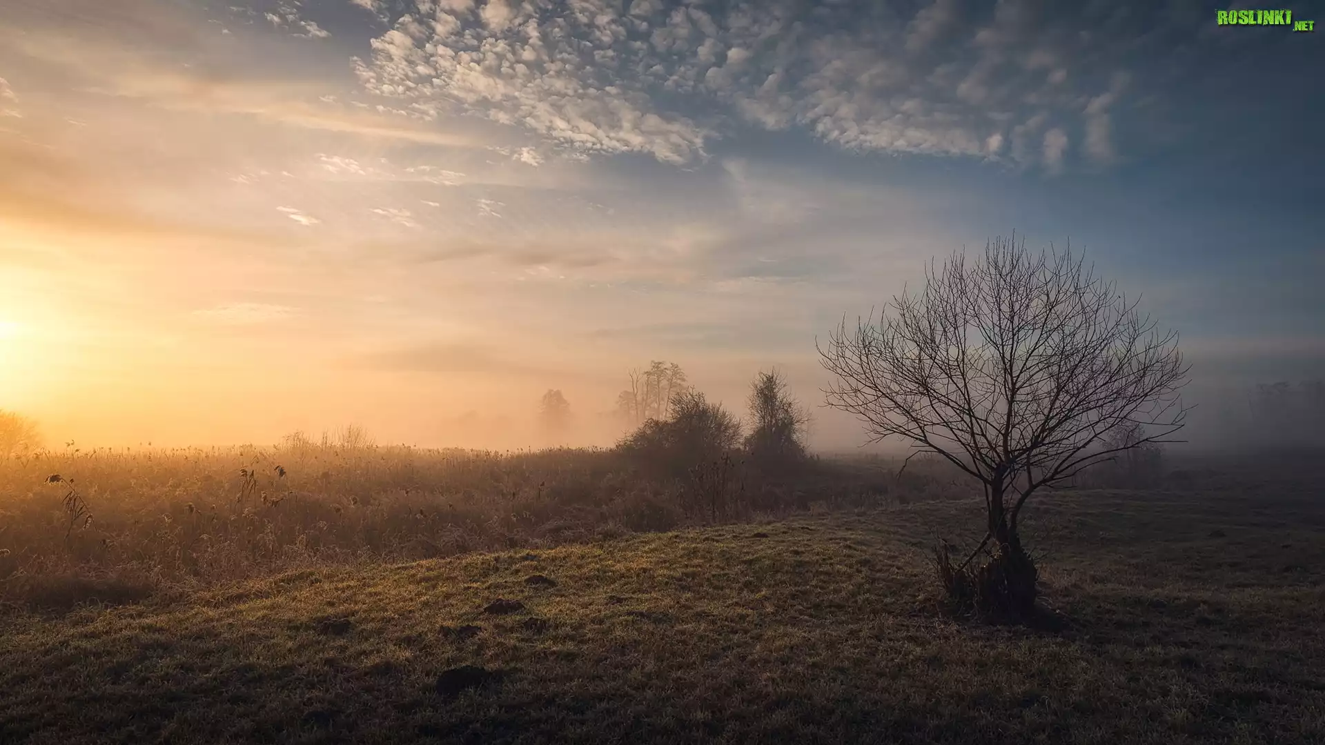 Rośliny: Drzewo, Łąka, Niebo, Chmury, Mgła, Wschód słońca