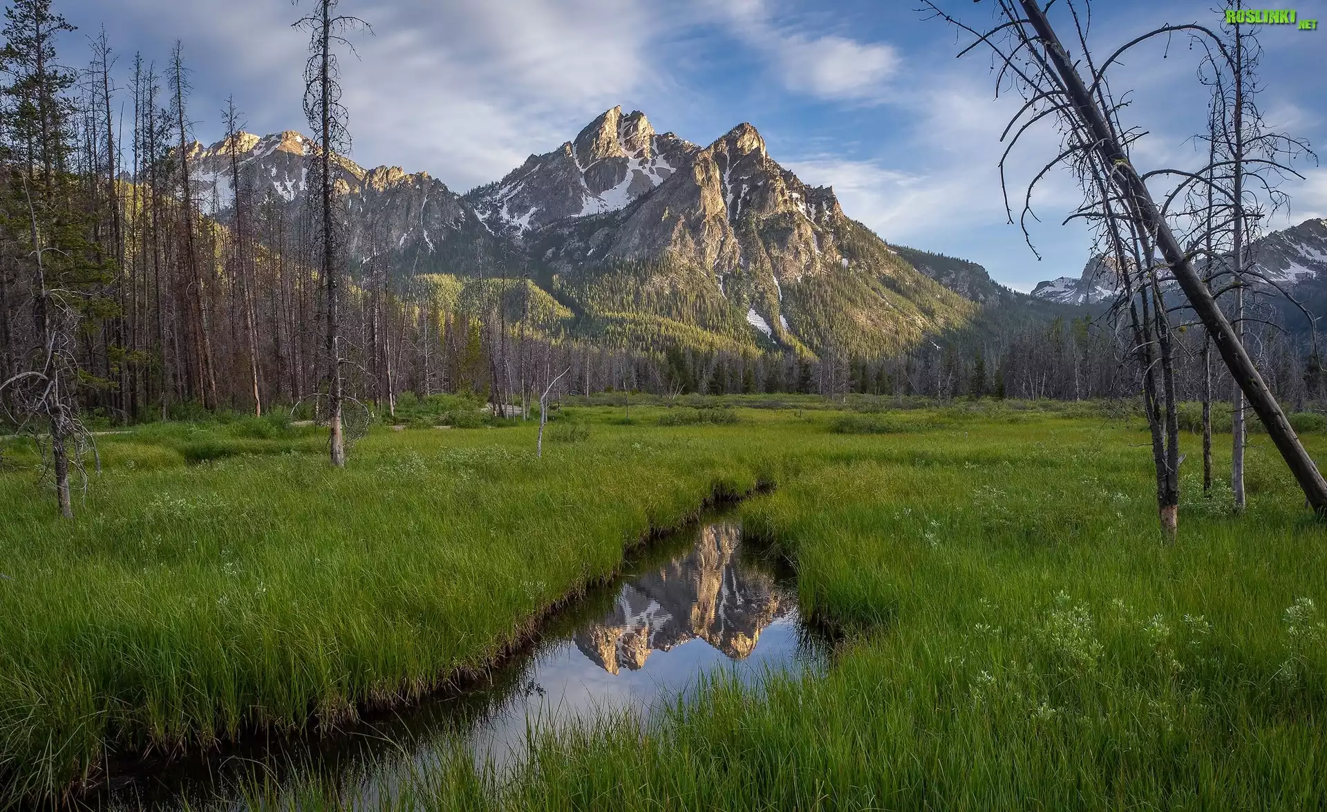 Rośliny: Góry, Góra McGown Peak, Drzewa, Łąka, Rzeka, Potok, Stan Idaho, Stany Zjednoczone