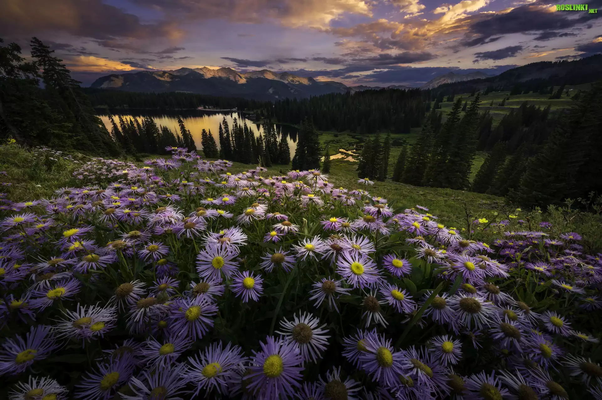 Rośliny: Polana, Kwiaty, Astry, Jezioro, Lasy, Drzewa, Góry, Zachód słońca, Łąka