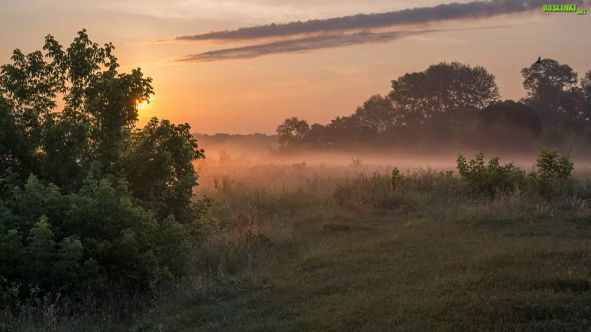 Rośliny: Łąka, Drzewa, Krzewy, Trawa, Wschód słońca, Mgła