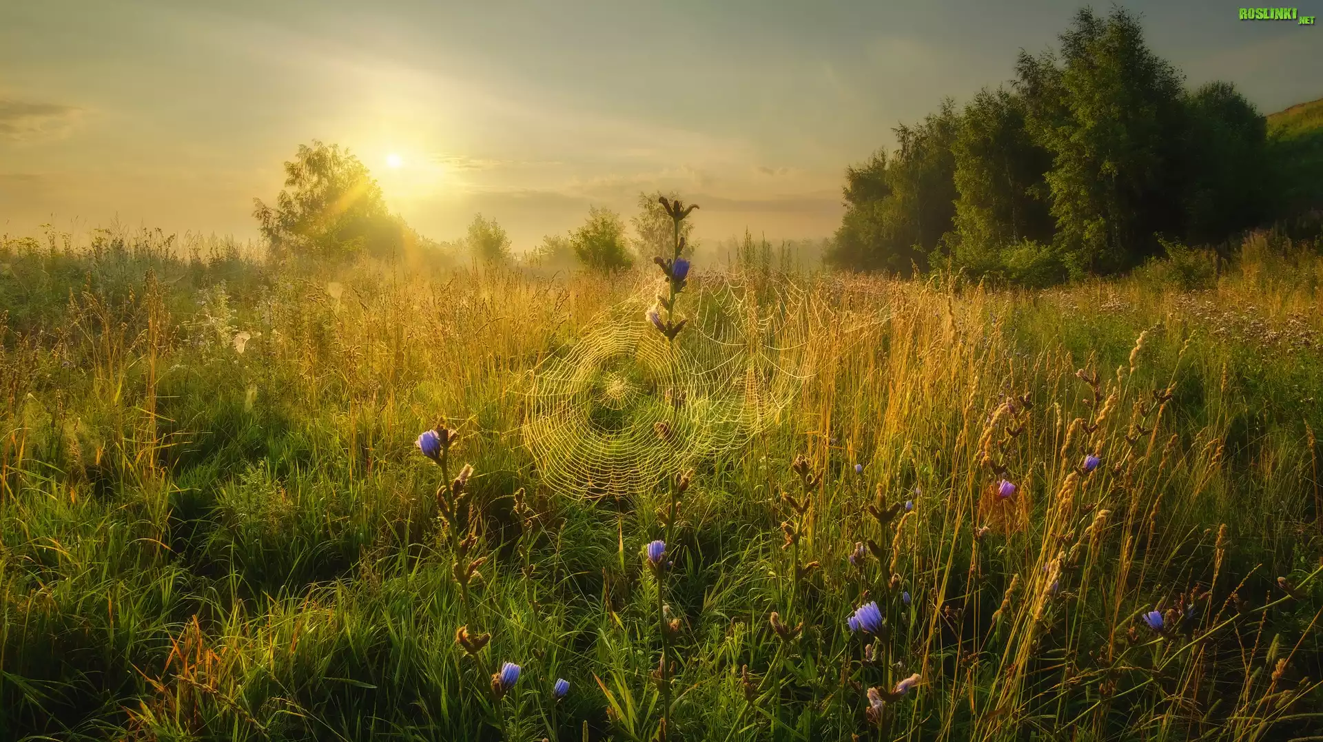 Rośliny: Lato, Łąka, Trawa, Kwiaty, Drzewa, Wschód słońca, Pajęczyny