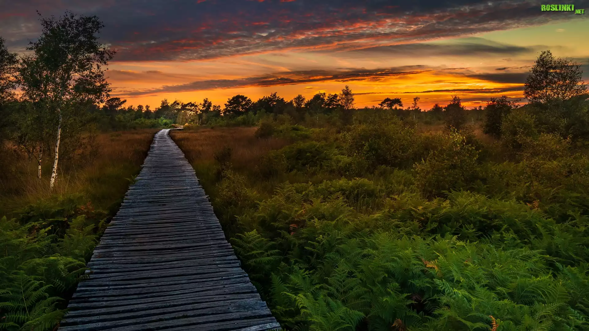 Rośliny: Łąka, Pomost, Drzewa, Krzewy, Paprocie, Zachód słońca