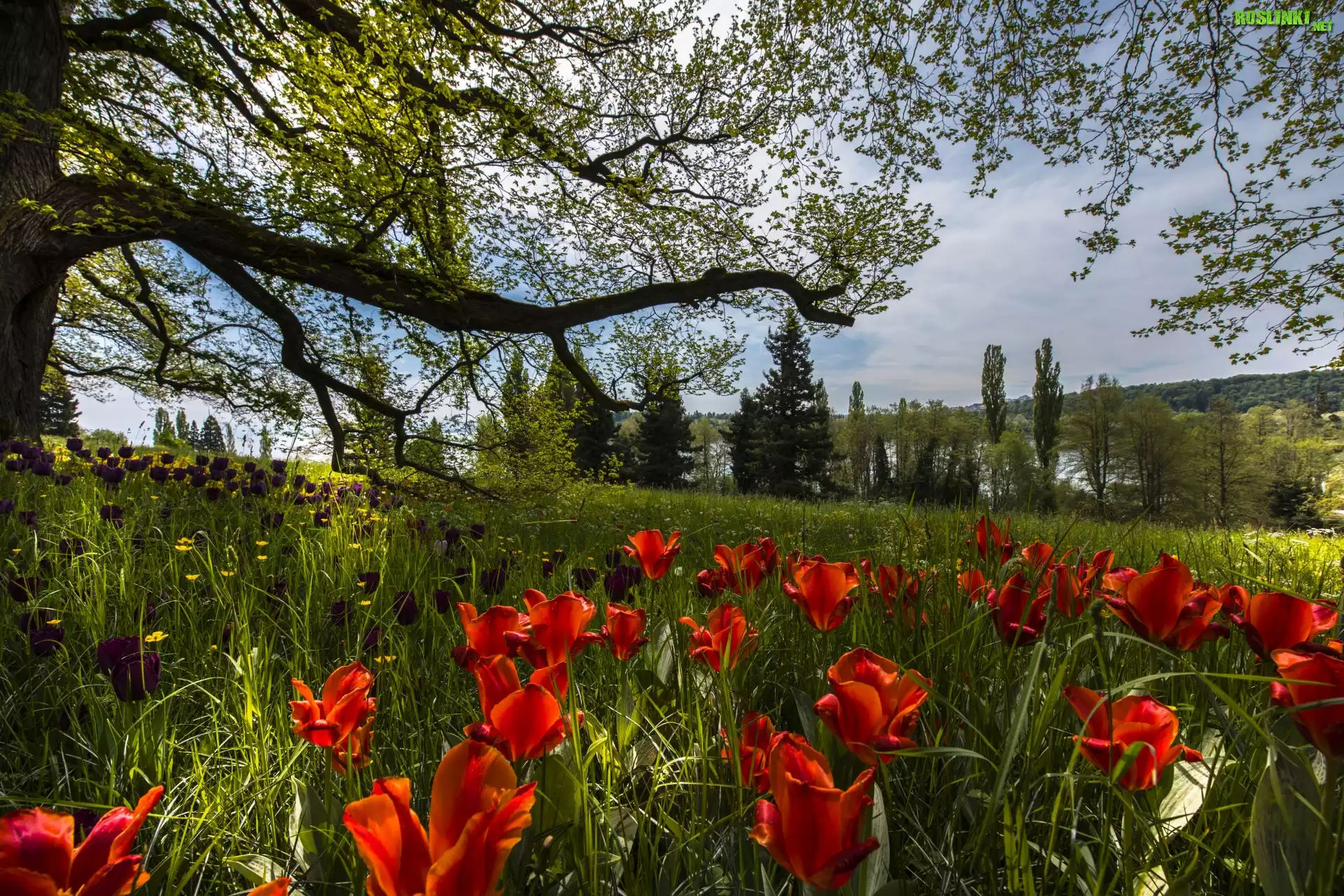 Rośliny: Wiosna, Łąka, Kwiaty, Tulipany, Trawa, Gałęzie, Drzewa