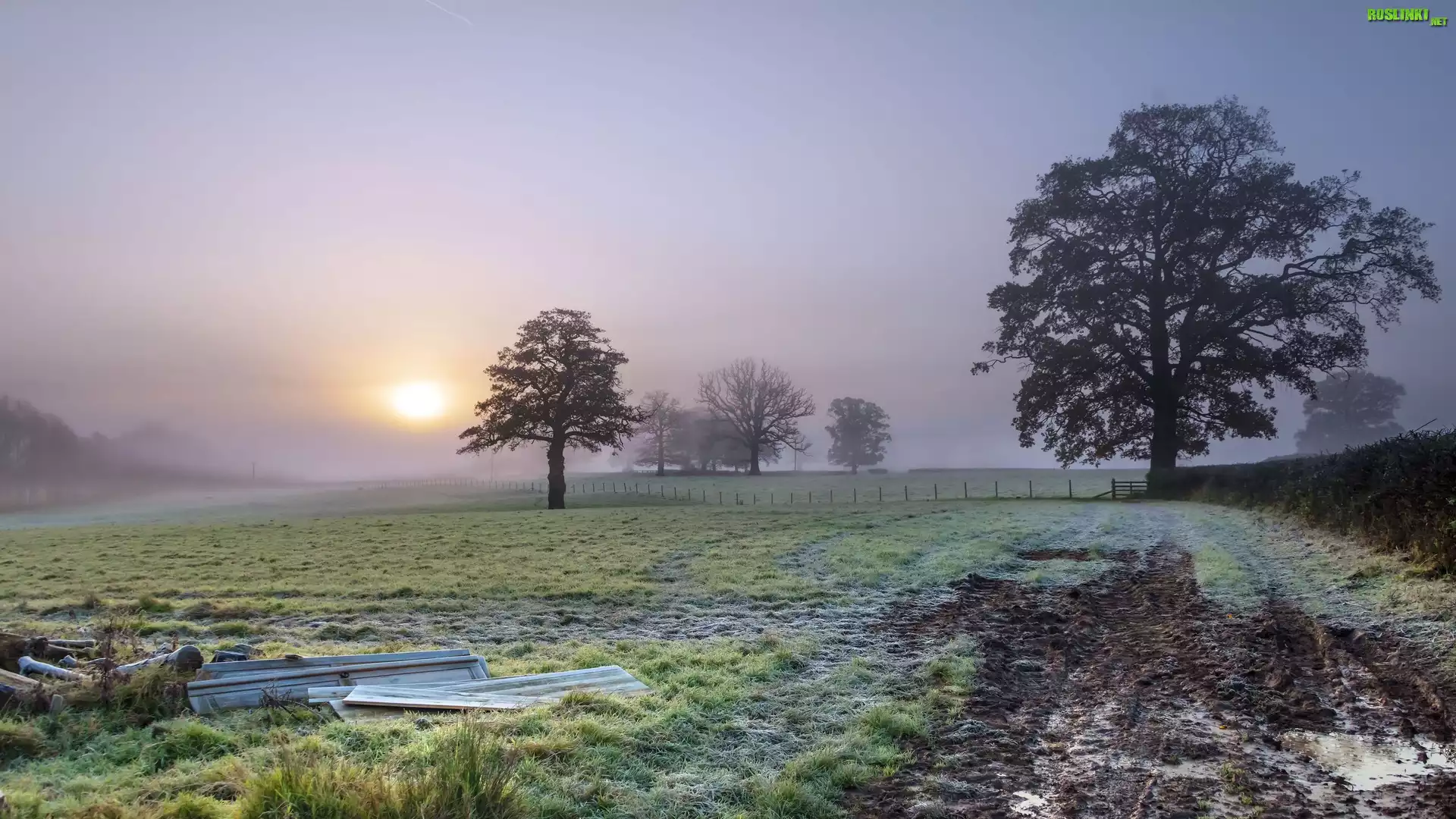 Rośliny: Łąki, Poranny, Przymrozek, Mgła, Wschód słońca, Drzewa