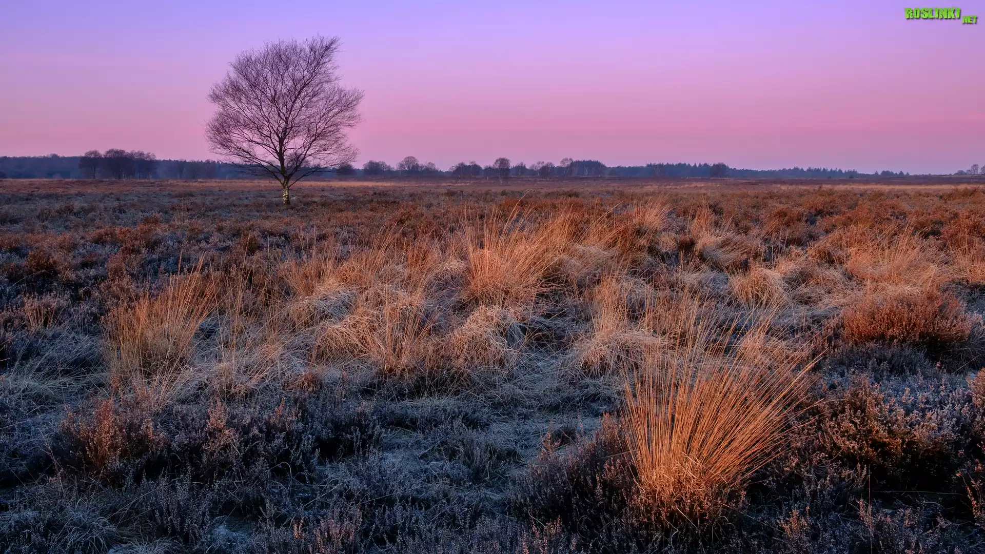 Rośliny: Pola, Łąki, Kępki, Traw, Szron, Drzewo, Wschód słońca