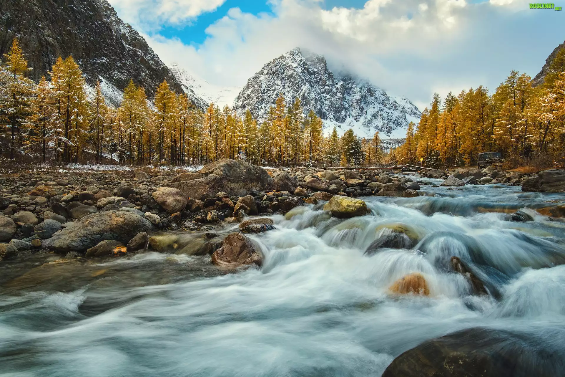 Góra Akturu, Góry Ałtaj, Rzeka Aktru, Kamienie, Drzewa, Syberia, Republika Ałtaju, Rosja