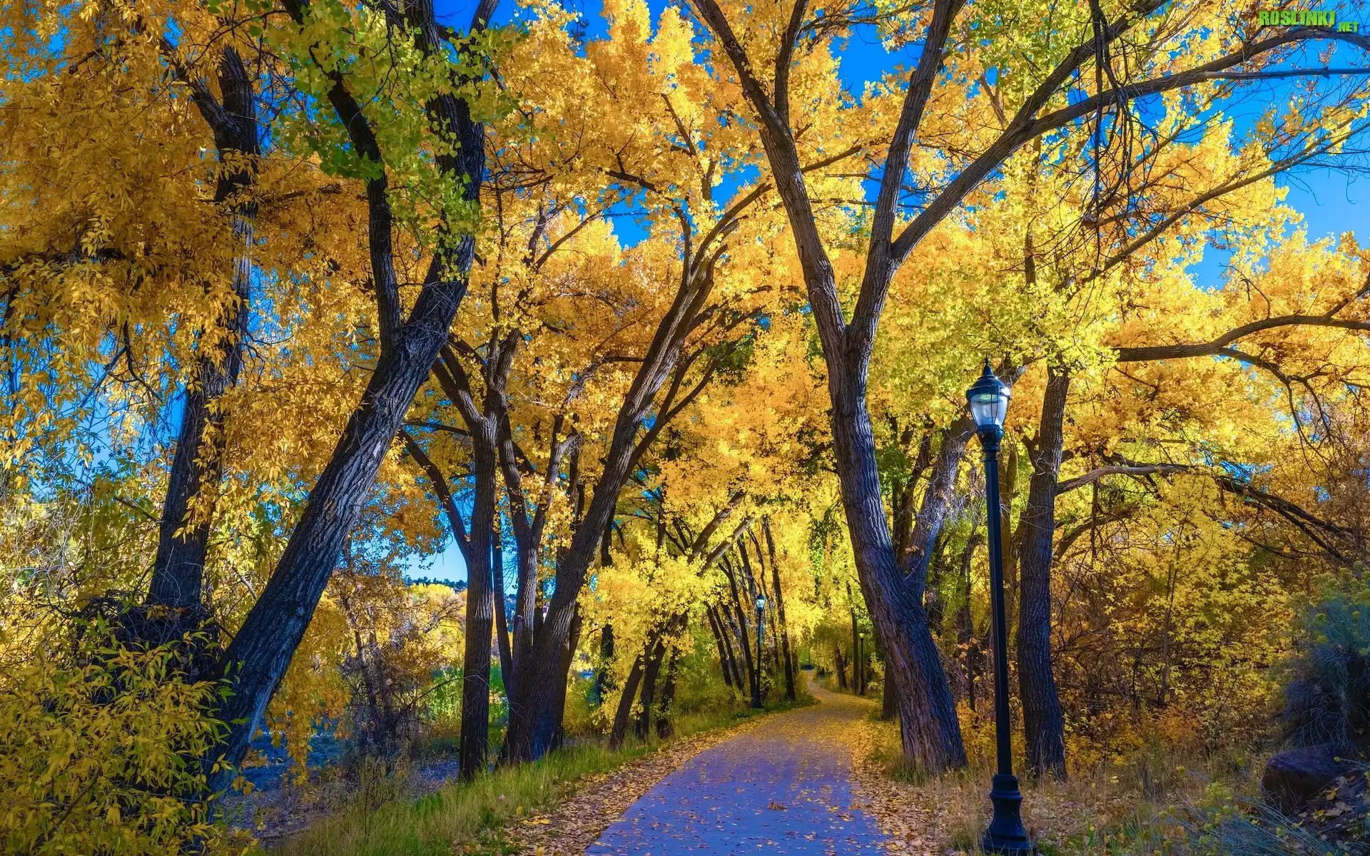 Rośliny: Jesień, Aleja, Drzewa, Droga, Latarnia