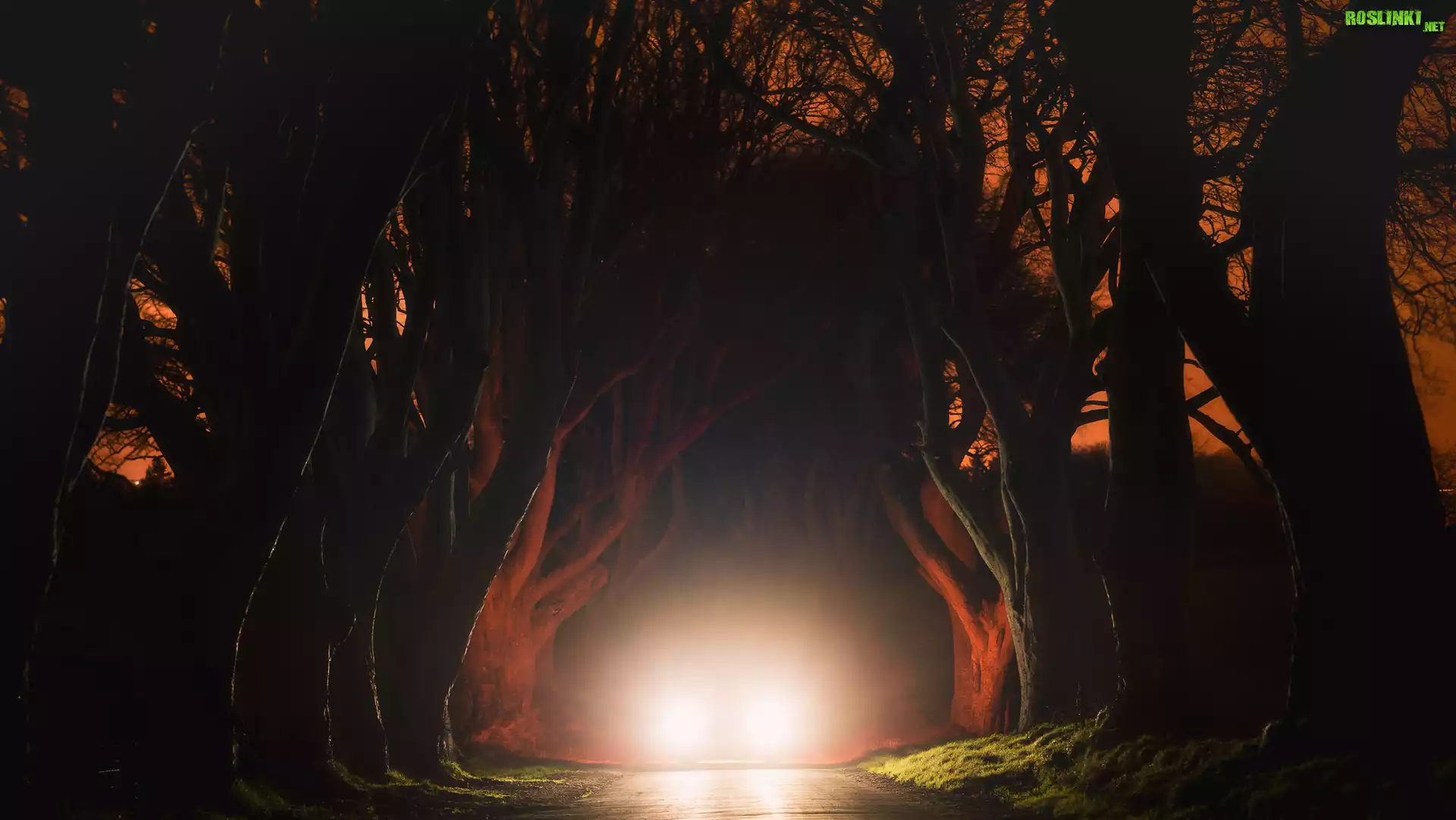 Rośliny: Noc, Droga, Światła, Drzewa, Buki, Aleja, Dark Hedges, Hrabstwo Antrim, Irlandia Północna