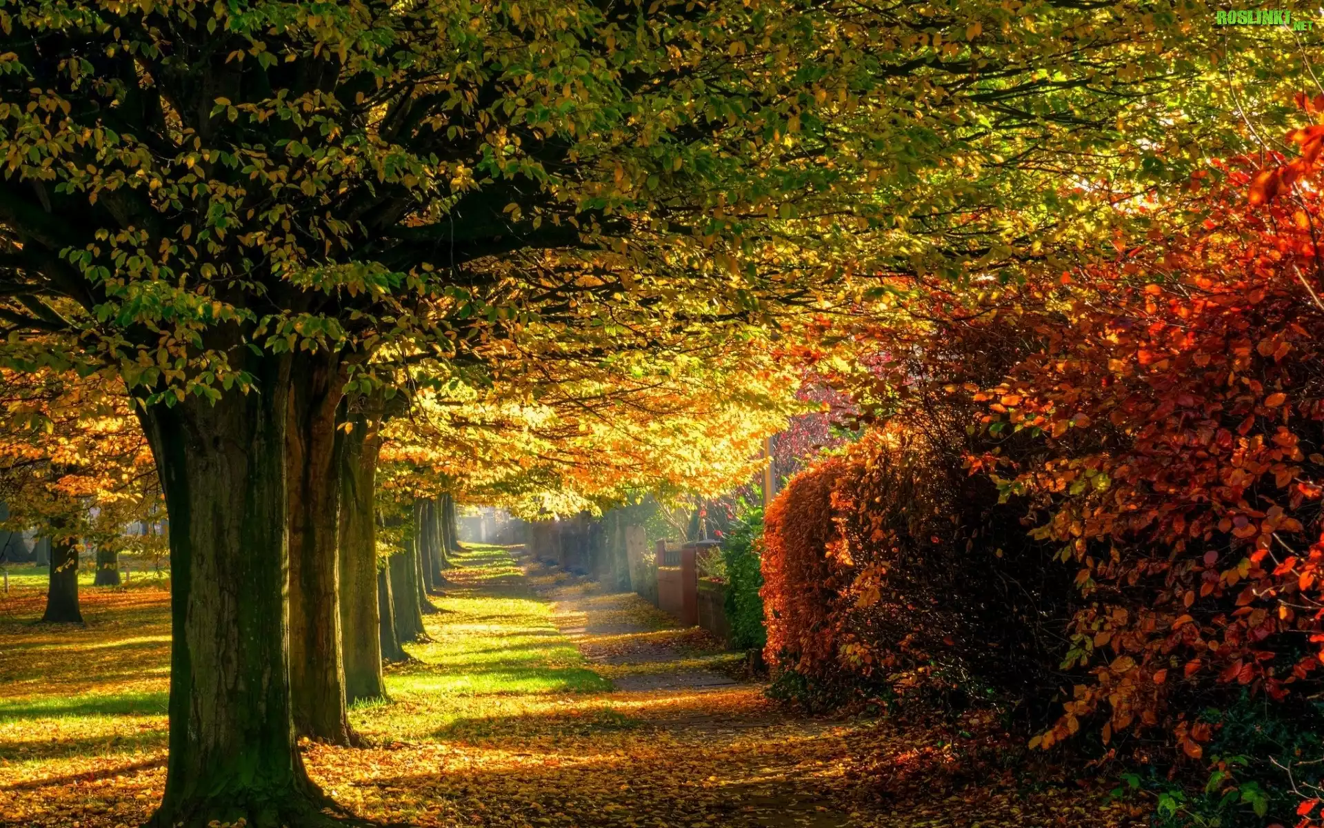 Rośliny: Park, Aleja, Drzewa, Liście, Przebijające, Światło, Jesień