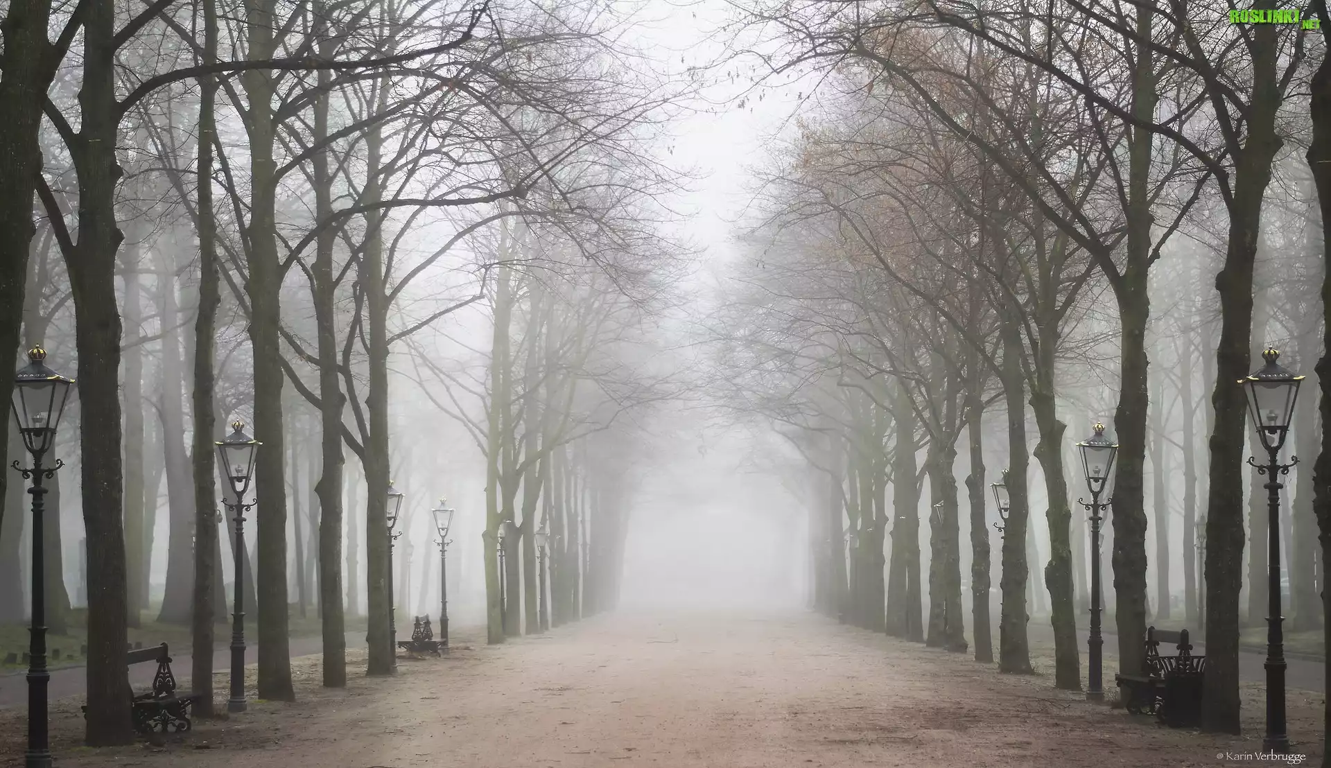 Park, Alejka, Mgła, Drzewa, Szpalery, Ławki, Latarnie
