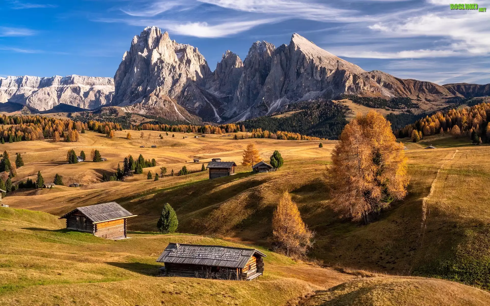 Włochy, Płaskowyż Seiser Alm, Dolina Val Gardena, Góry Sassolungo, Dolomity, Domy, Drzewa, Jesień |