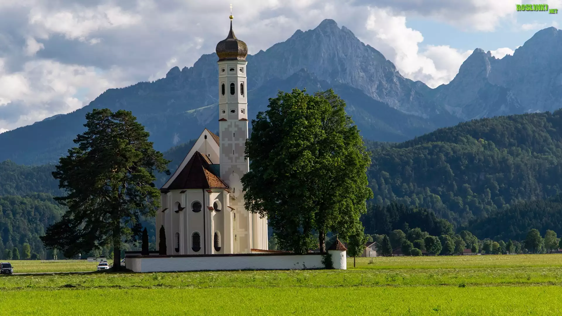 Rośliny: Kościół, Eglise Saint Coloman, Góry Alpy, Las, Drzewa, Miejscowość Schwangau, Bawaria, Niemcy