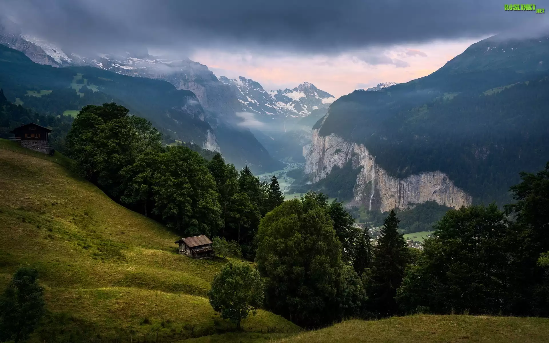 Szwajcaria, Gmina Lauterbrunnen, Wengen, Góry, Alpy Berneńskie, Dolina Lauterbrunnen, Lasy, Drzewa, Domy |