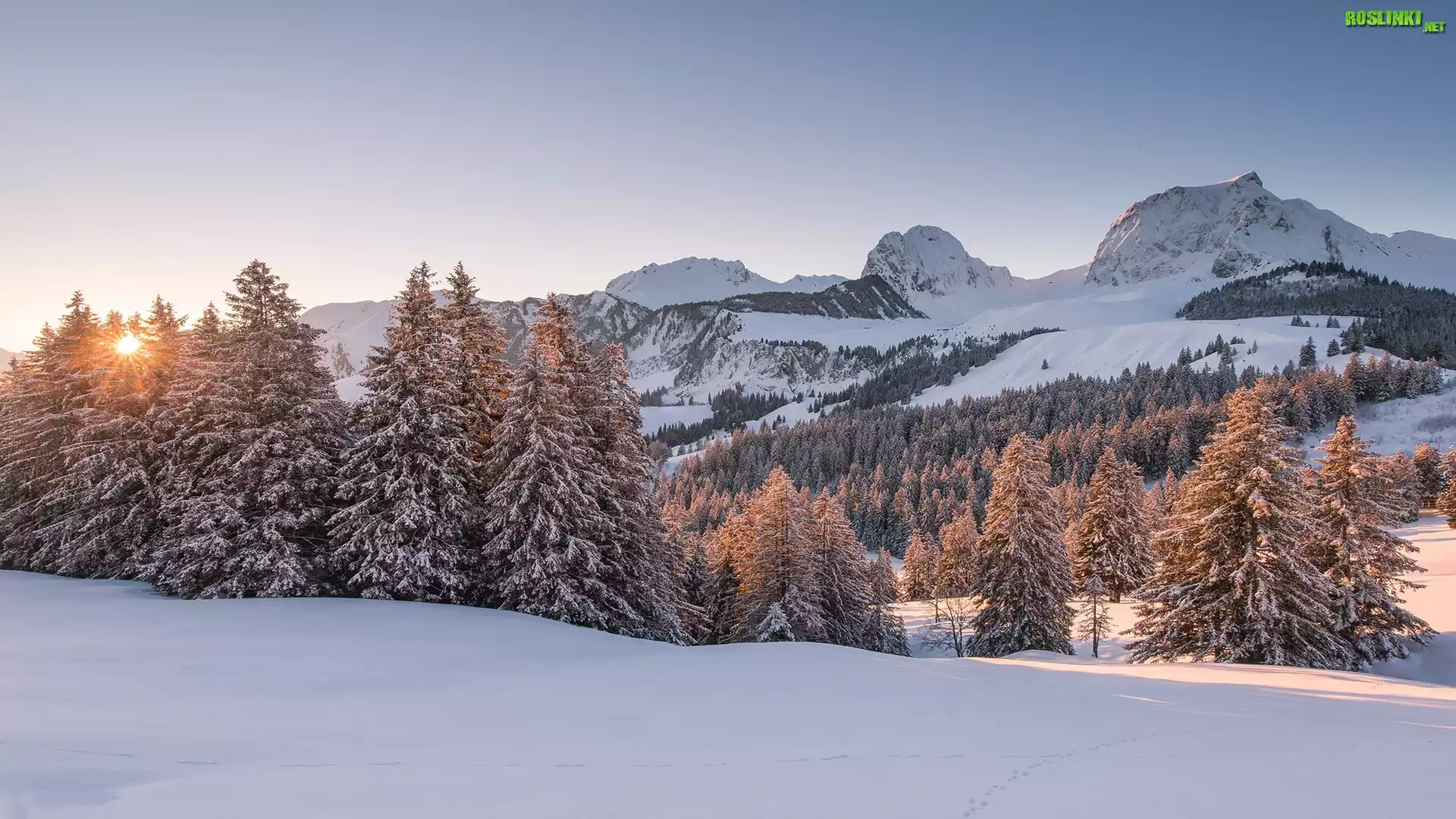 Szwajcaria, Kanton Berno, Góry Alpy Berneńskie, Szczyt Gantrisch, Wschód Słońca, Góry, Zima, Las, Drzewa |