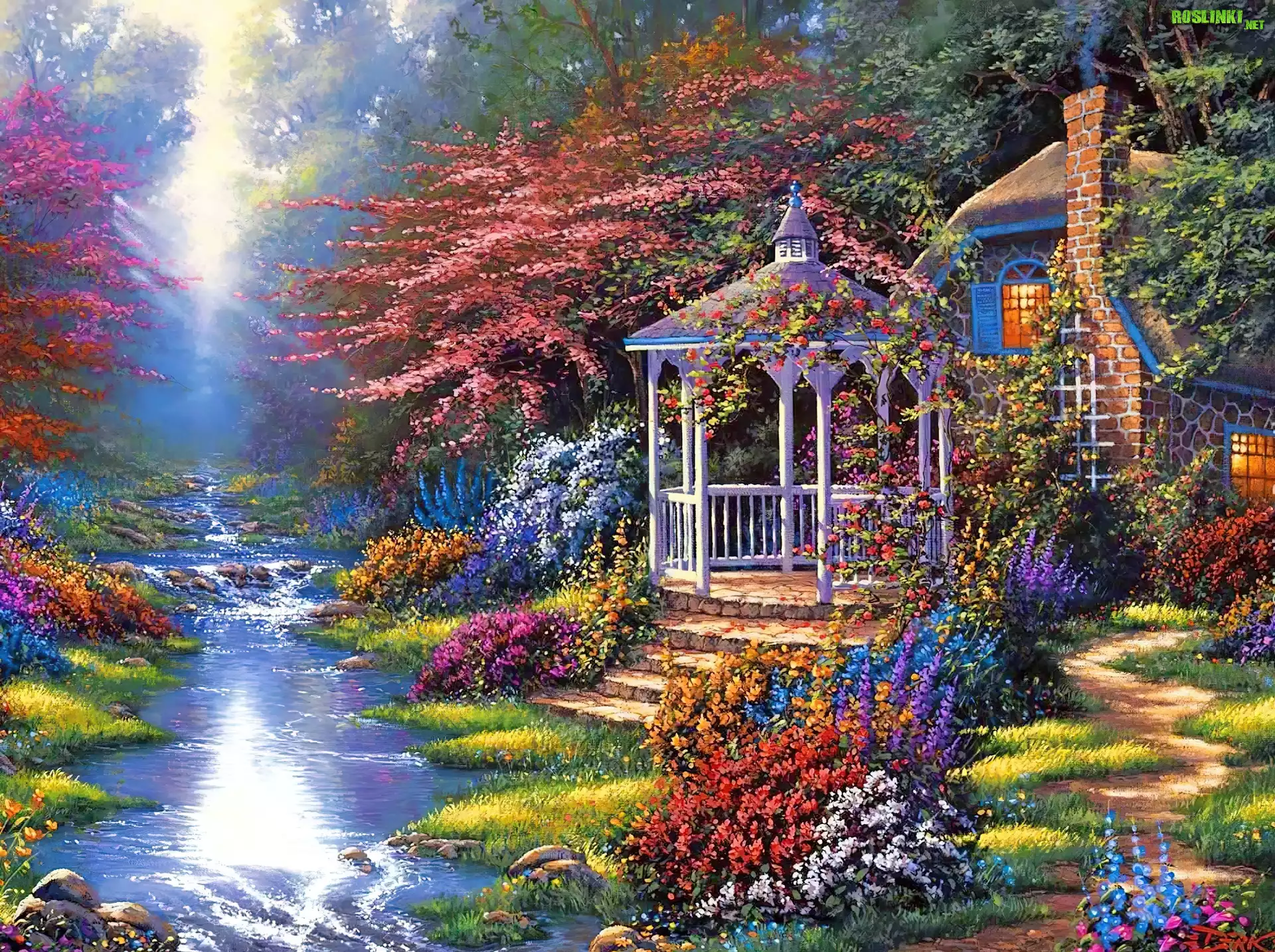 Rośliny: Altana, Dom, Rzeczka, Drzewa
