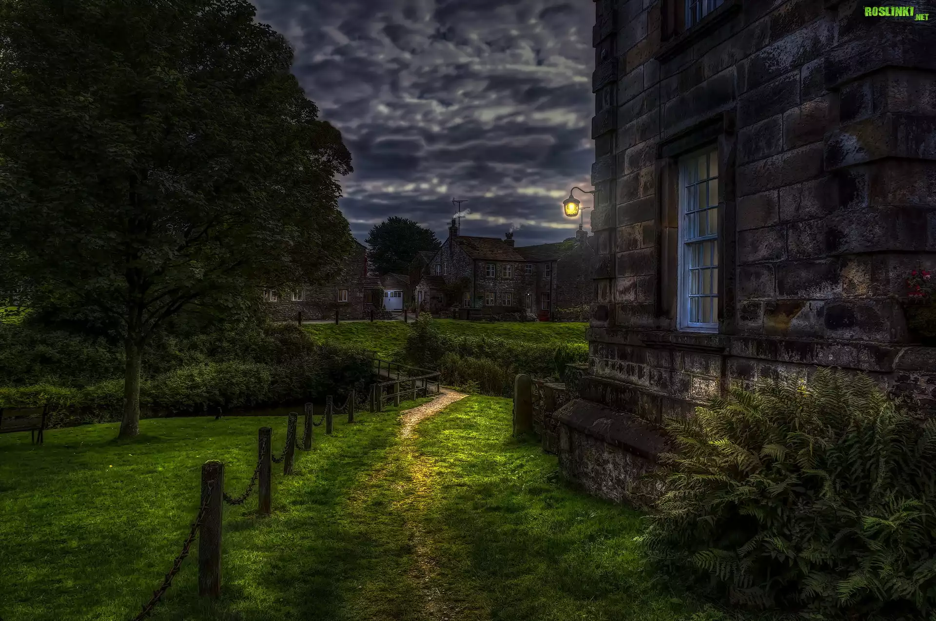 Rośliny: Domy, Drzewa, Paproć, Noc, Ogrodzenie, Ścieżka, Wieś Threshfield, Craven, Anglia