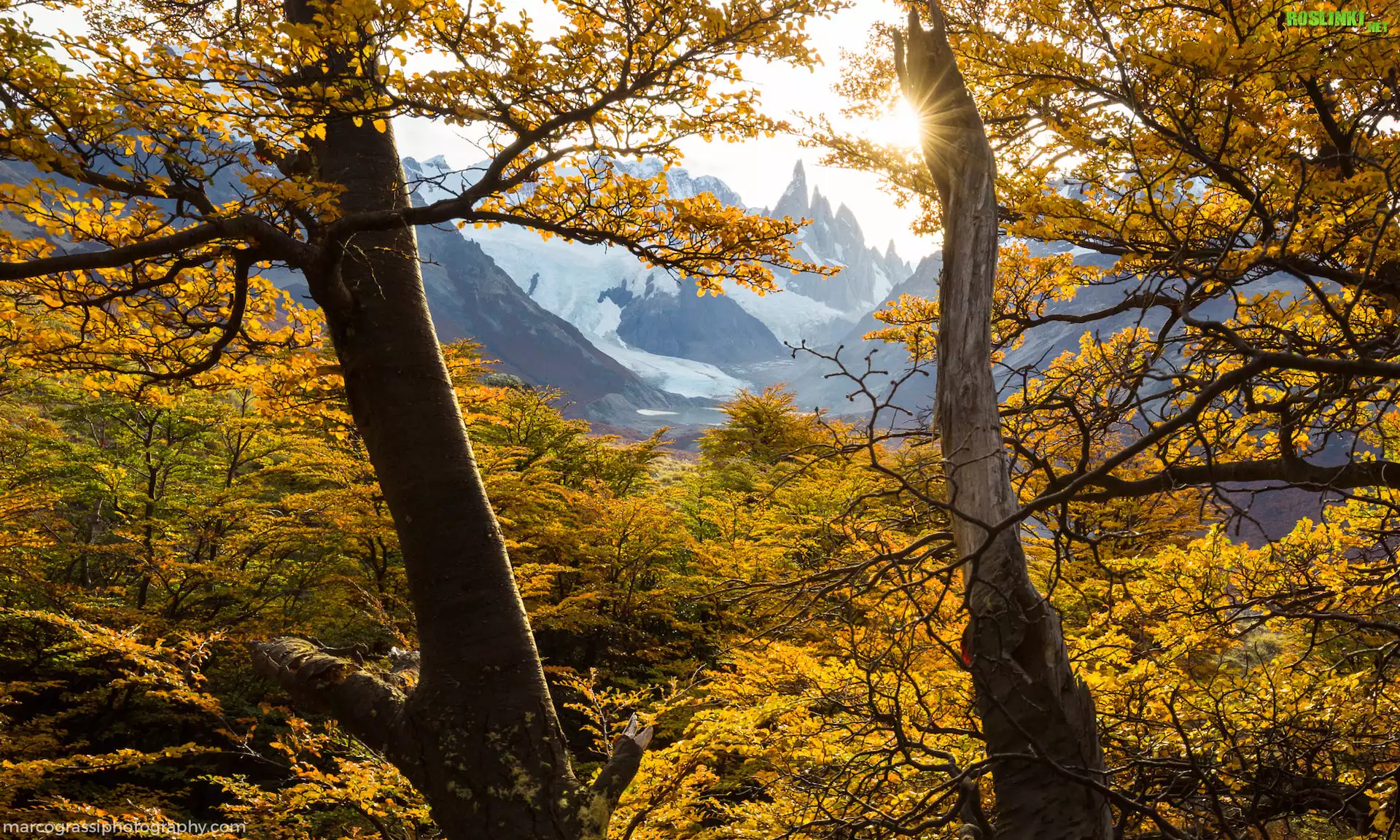 Rośliny: Argentyna, Patagonia, Góra, Fitz Roy, Jesień, Drzewa, Promienie słońca
